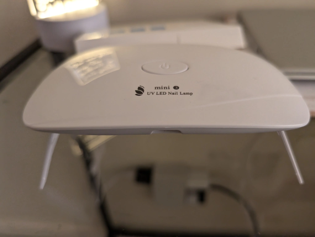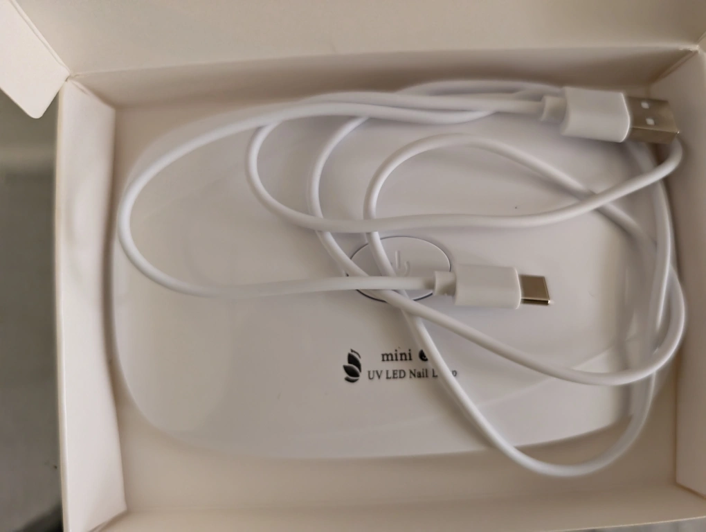 95This is a white mini UV LED nail lamp. The lamp is small and portable, making it perfect for travelling or home use. It comes with a USB charging cord.