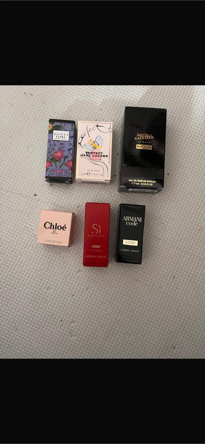 113Collection of miniature perfumes. Includes Gucci Flora, Marc Jacobs Perfect, Jean Paul Gaultier Le Male, Chloe, and Giorgio Armani Si Passone and Armani Code. Great for travel or sampling. $18/each