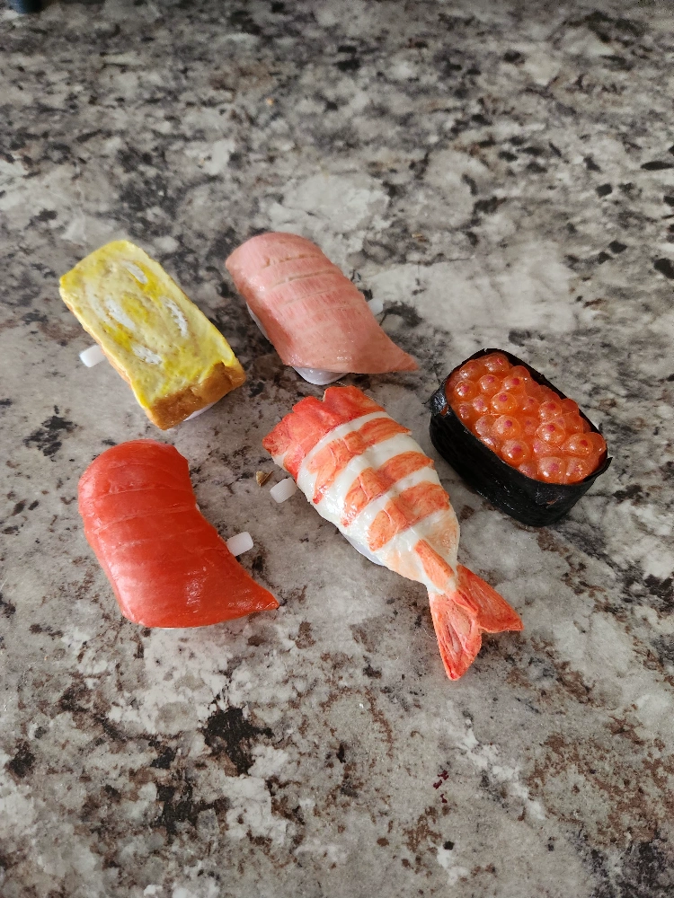 Adorable miniature sushi pieces. Perfect for a collectible display. Each of them moving fine. $15 each or $70 for 5.
