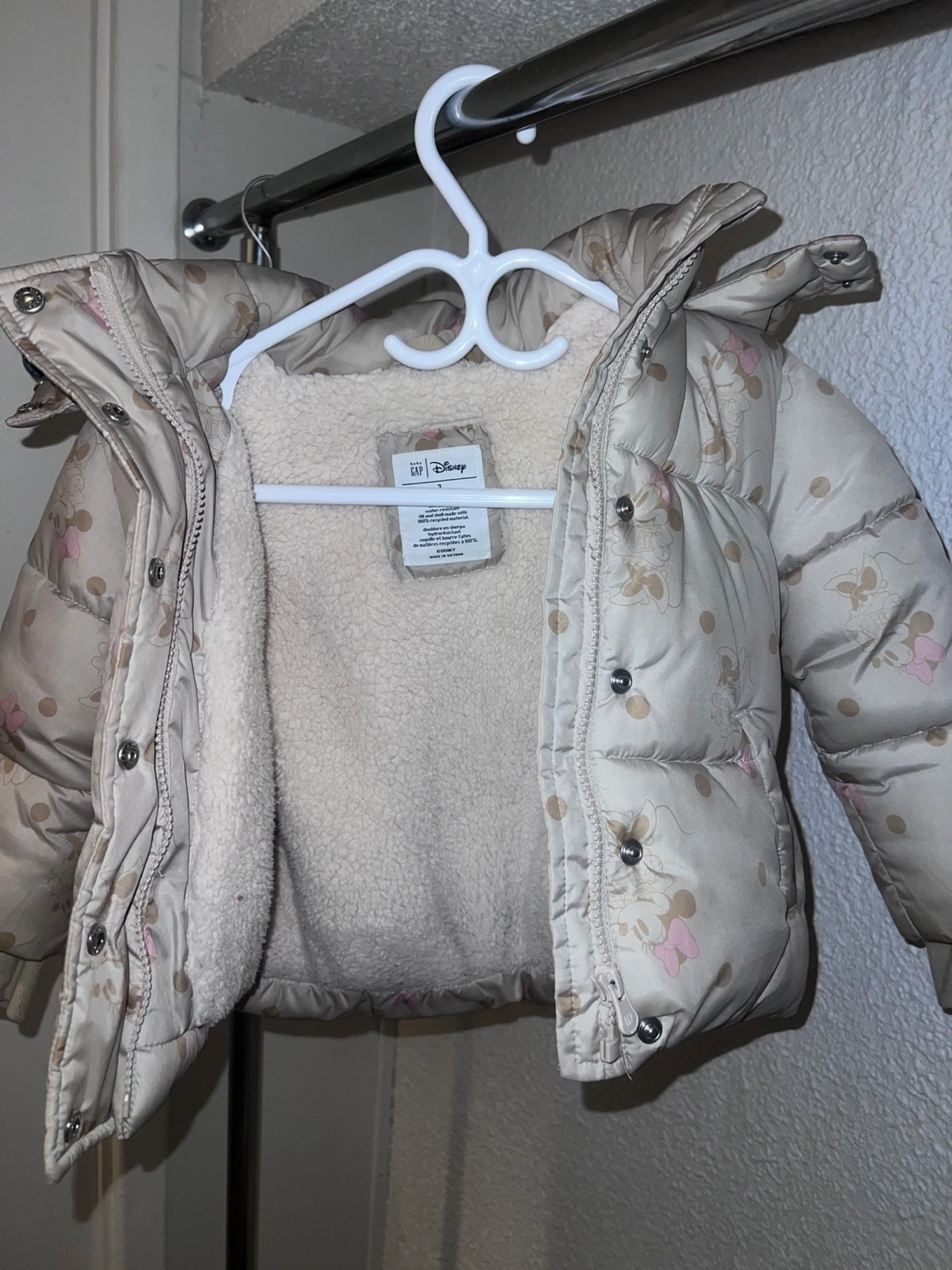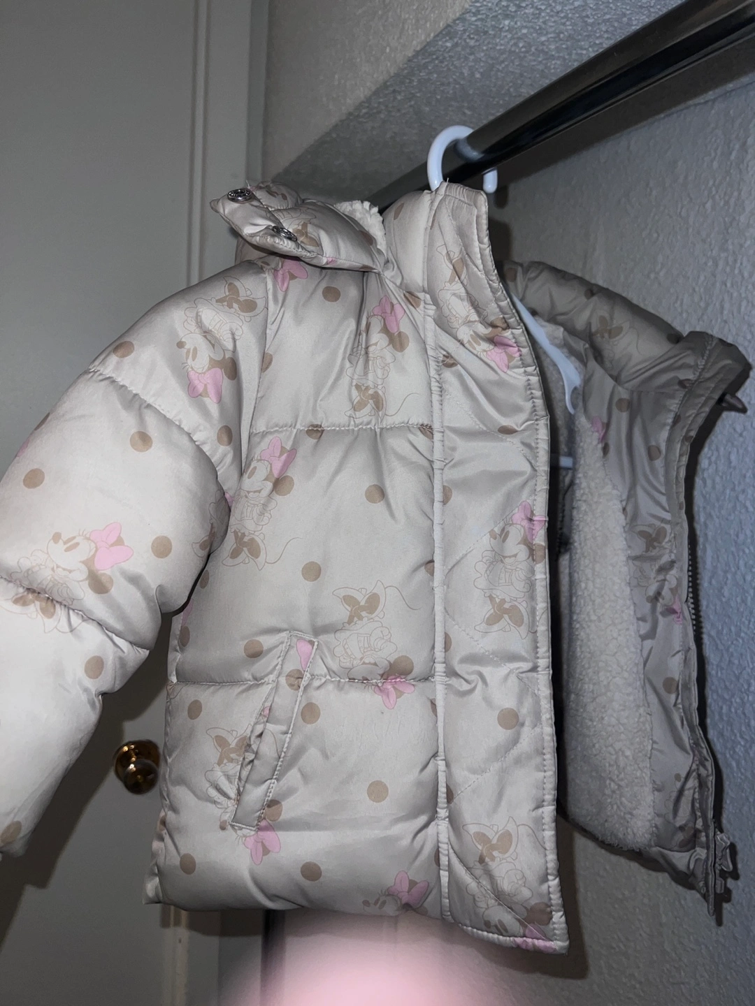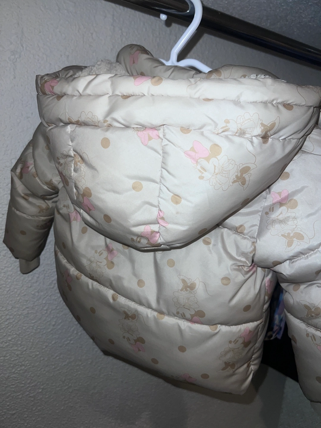 10Adorable Minnie Mouse puffer jacket. Beige colour, features Minnie Mouse print. Warm, sherpa-lined interior. Zipper closure. Great for fall and winter.