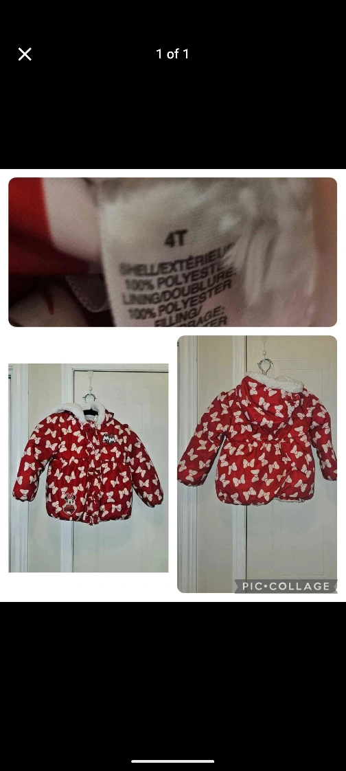 Super cute red Minnie Mouse puffer jacket for your little one! It's a size 4T and made with 100% polyester shell, lining, and filling. Perfect for keeping them warm and stylish!
