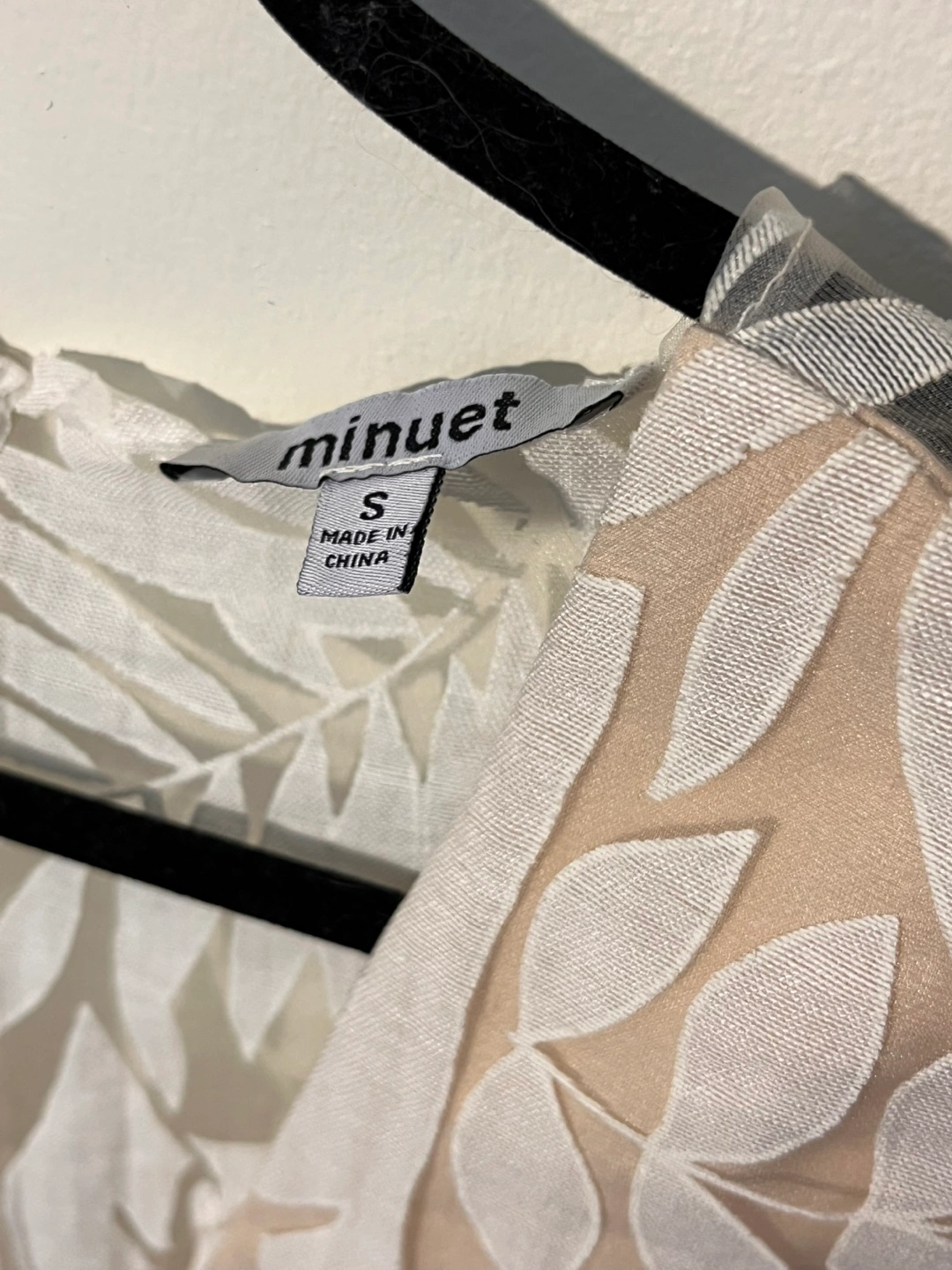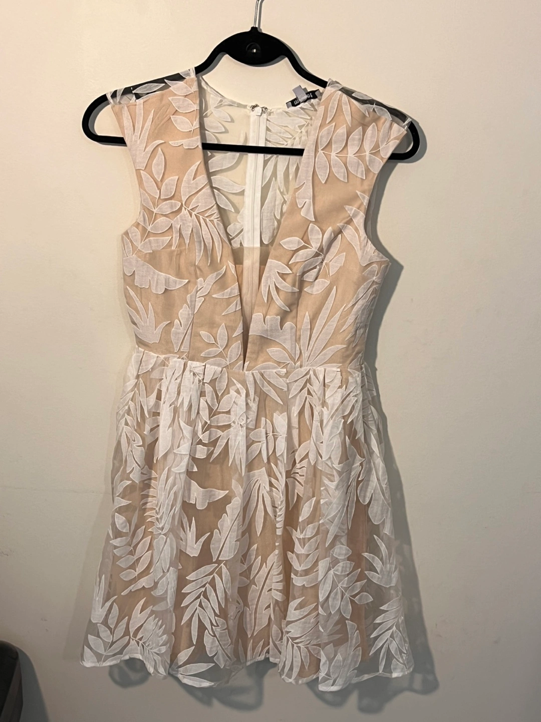 This is a lovely Minuet dress in a size small. It features a beautiful floral design on a nude background. Perfect for a special occasion or a night out!