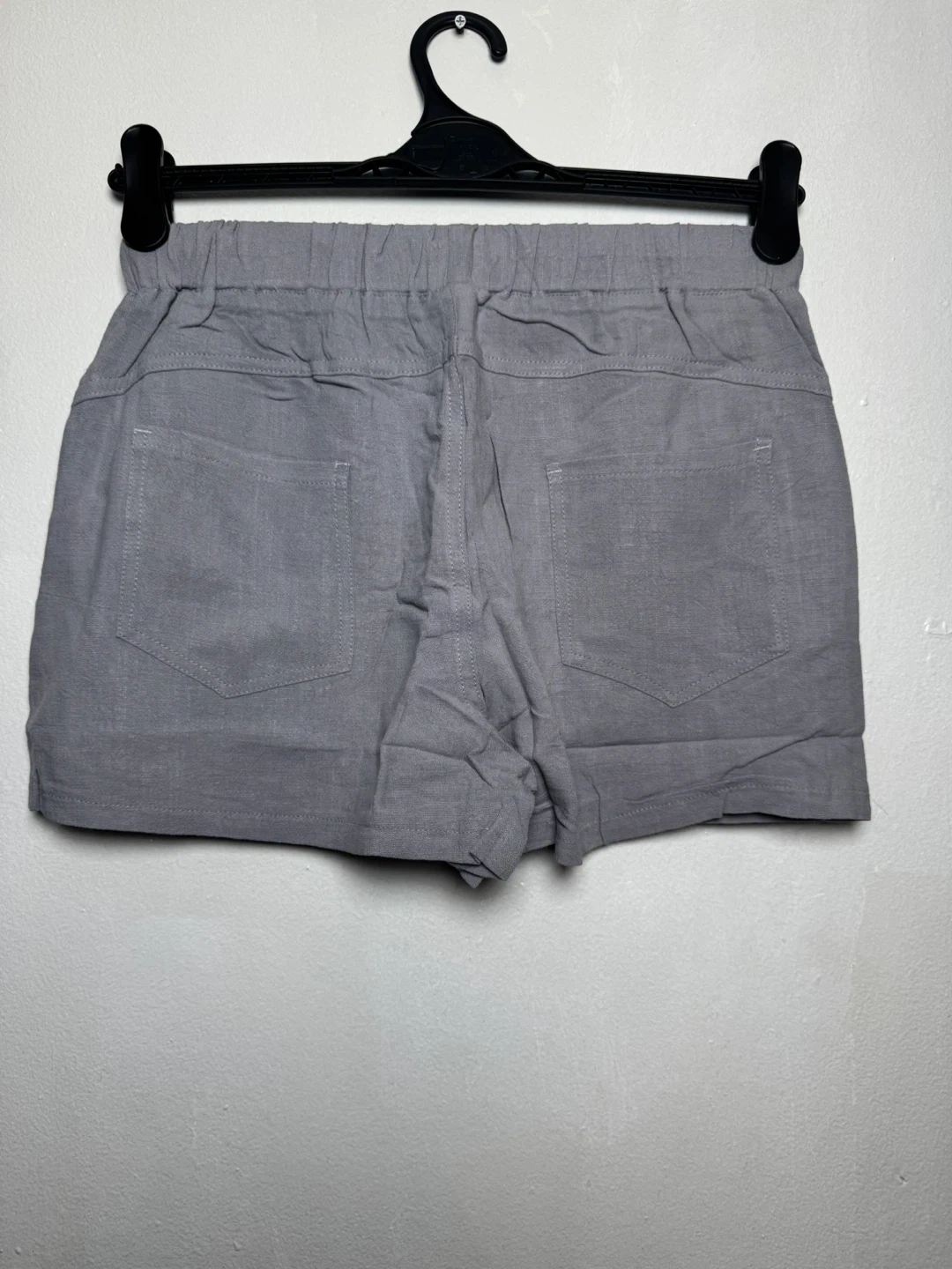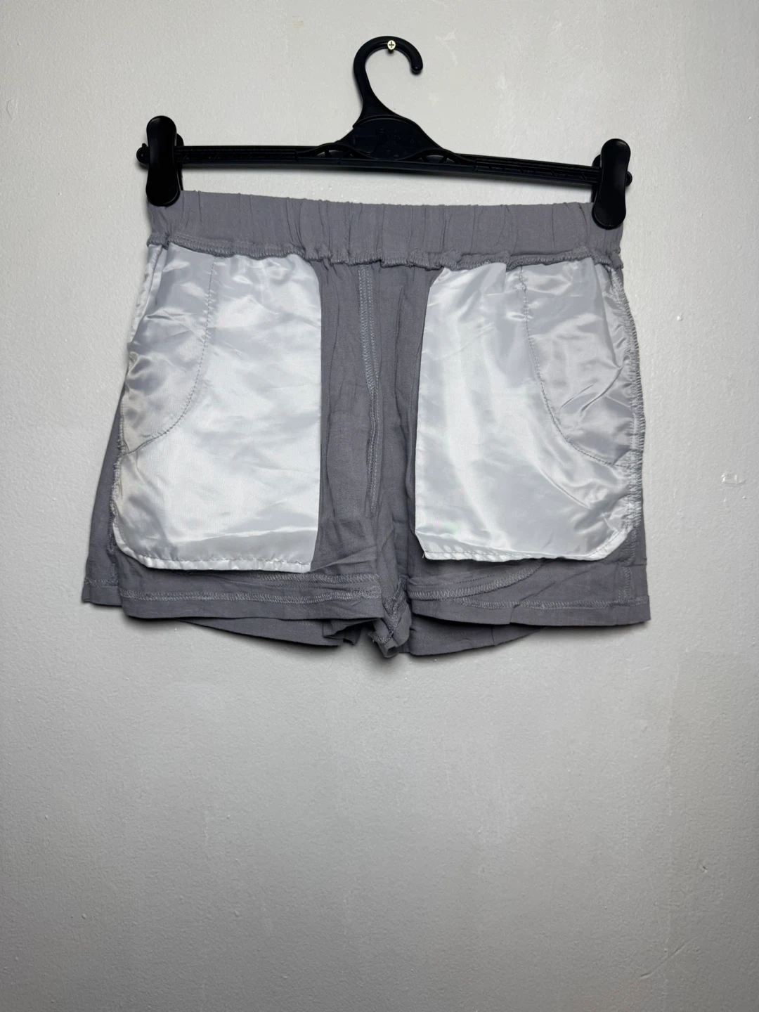 Comfortable gray shorts with an elastic waistband and drawstring. Features front pockets with silky lining and back pockets. Size M.