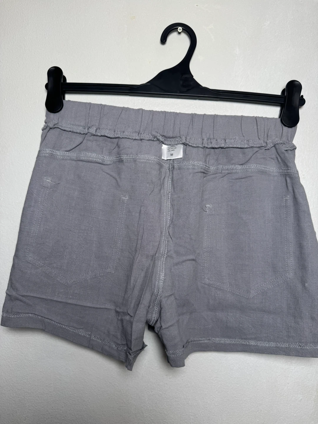Comfortable gray shorts with an elastic waistband and drawstring. Features front pockets with silky lining and back pockets. Size M.