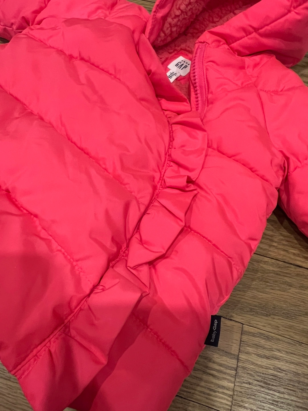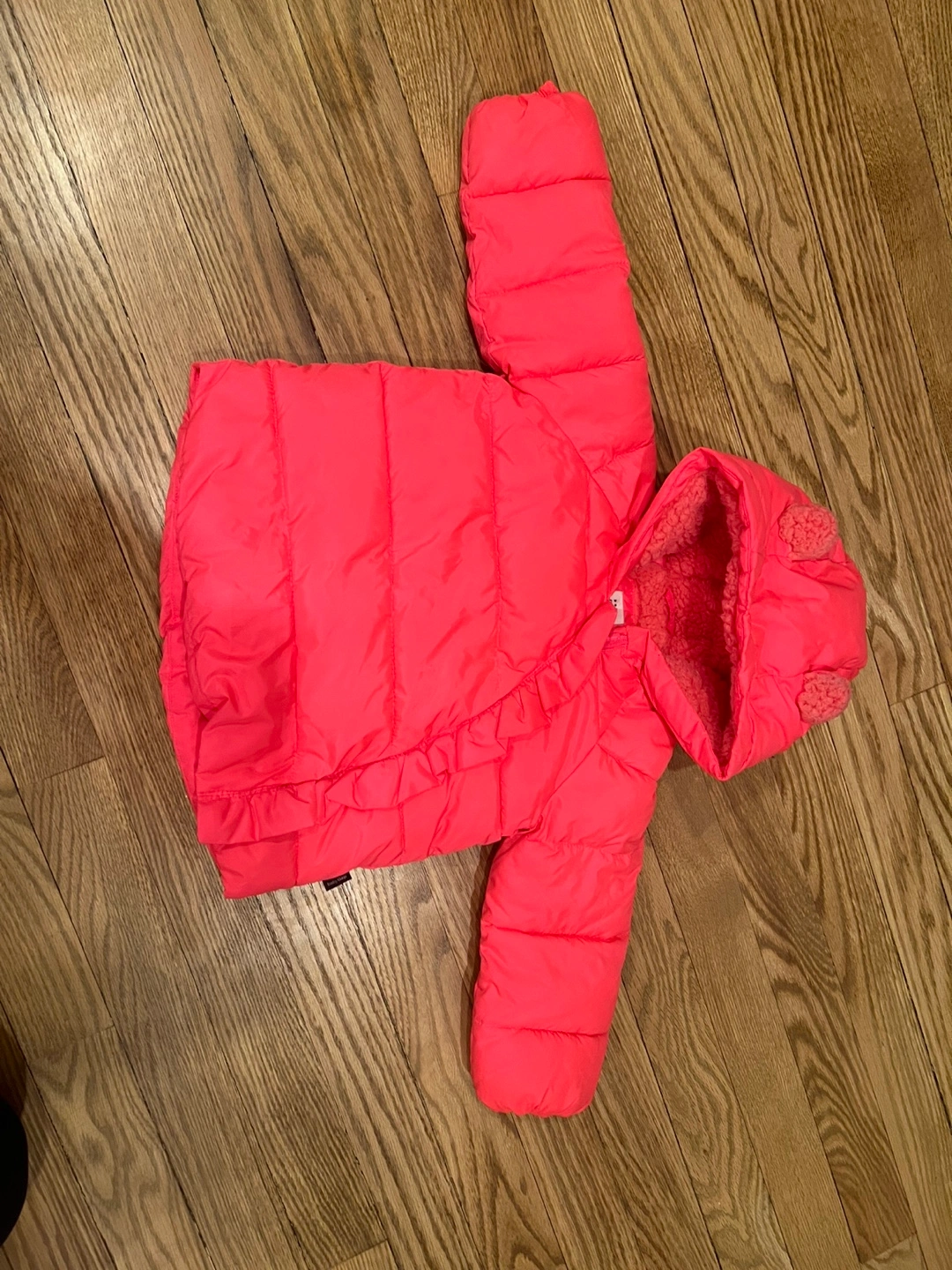 Adorable pink puffer jacket. Size 12-18 months. Features a fluffy hood and cute ruffle detail. Warm and cozy for colder weather. Gently used.