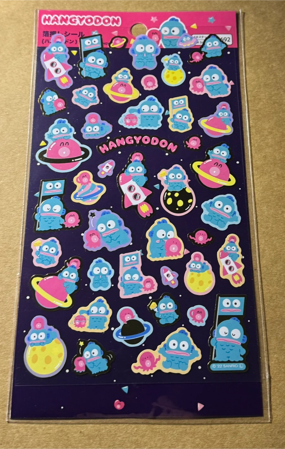 This set includes a large sticker sheet featuring Hangyodon and friends in space-themed designs, plus four smaller sticker cards. All stickers are colourful and fun for decorating planners or notebooks.