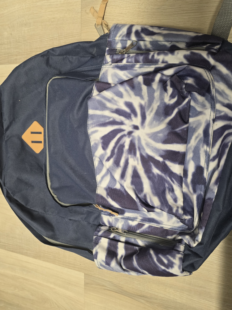 This blue backpack features a cool tie-dye pattern on the front pocket. It's perfect for school, travel, or everyday use. It has adjustable straps for a comfortable fit and plenty of room for your belongings. Get ready to carry your stuff in style!