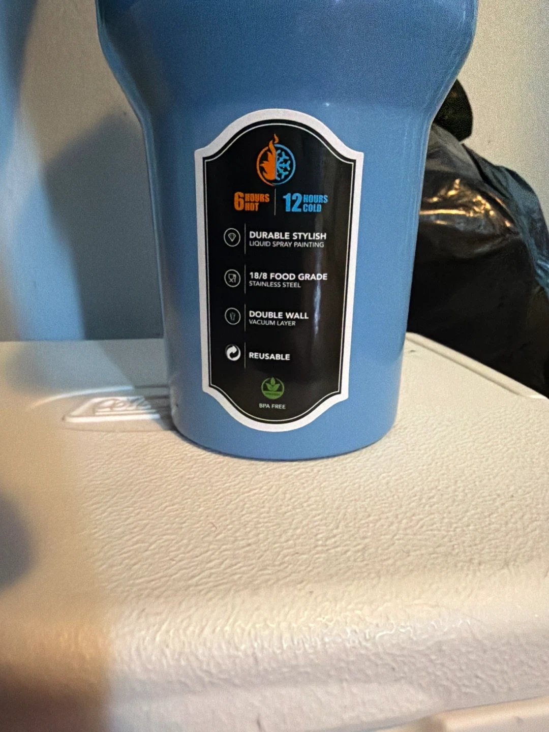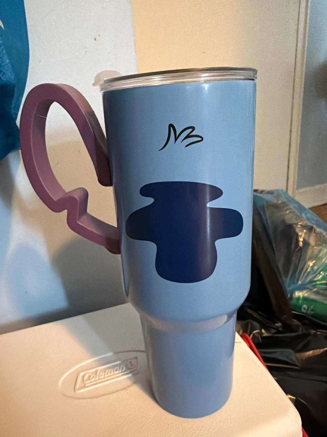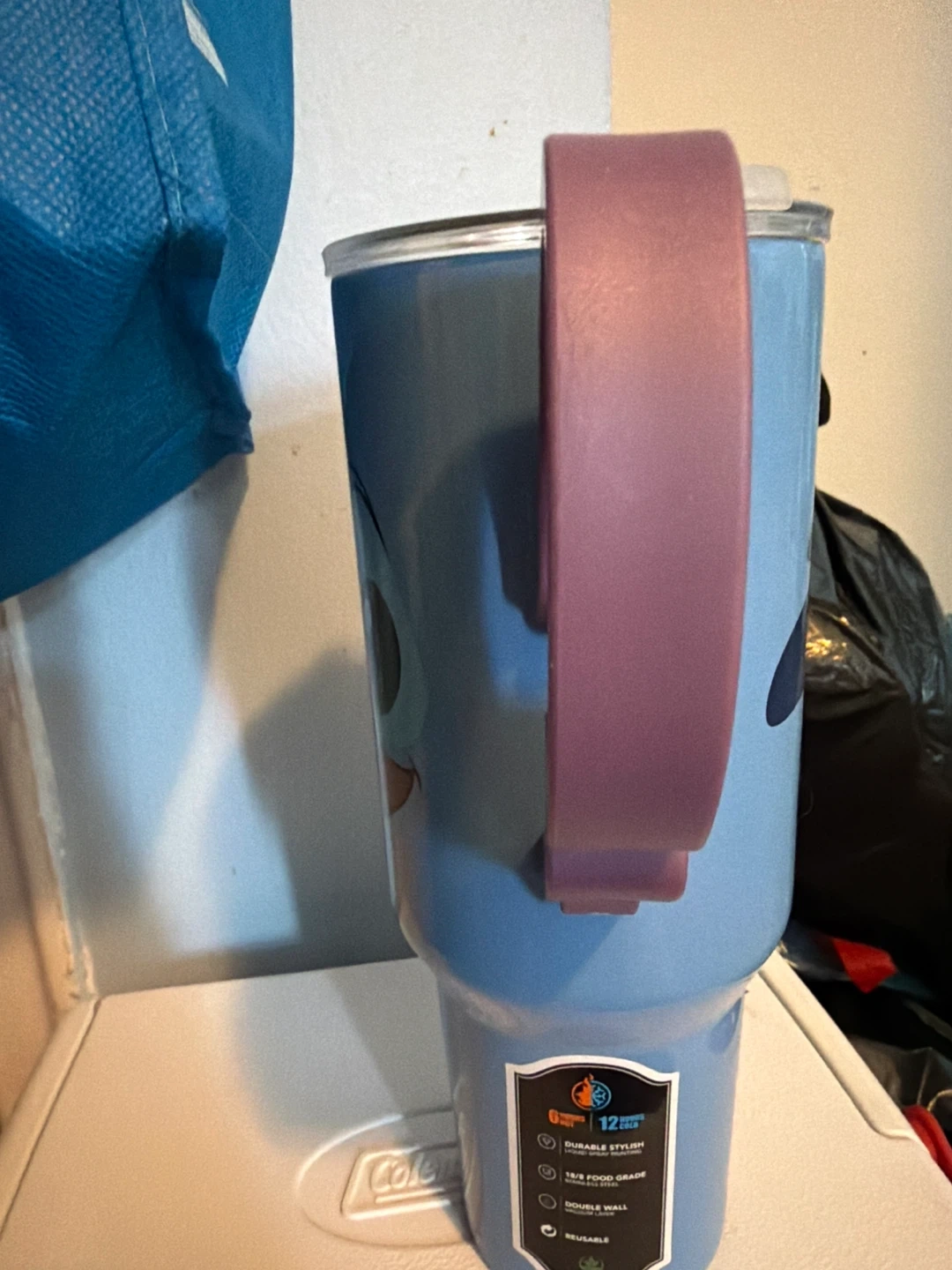 Light blue tumbler featuring Stitch's face and a purple handle. It's made with double-wall vacuum insulation using 18/8 food-grade stainless steel. Keeps drinks hot for 6 hours and cold for 12 hours. It's reusable and BPA-free! Never used