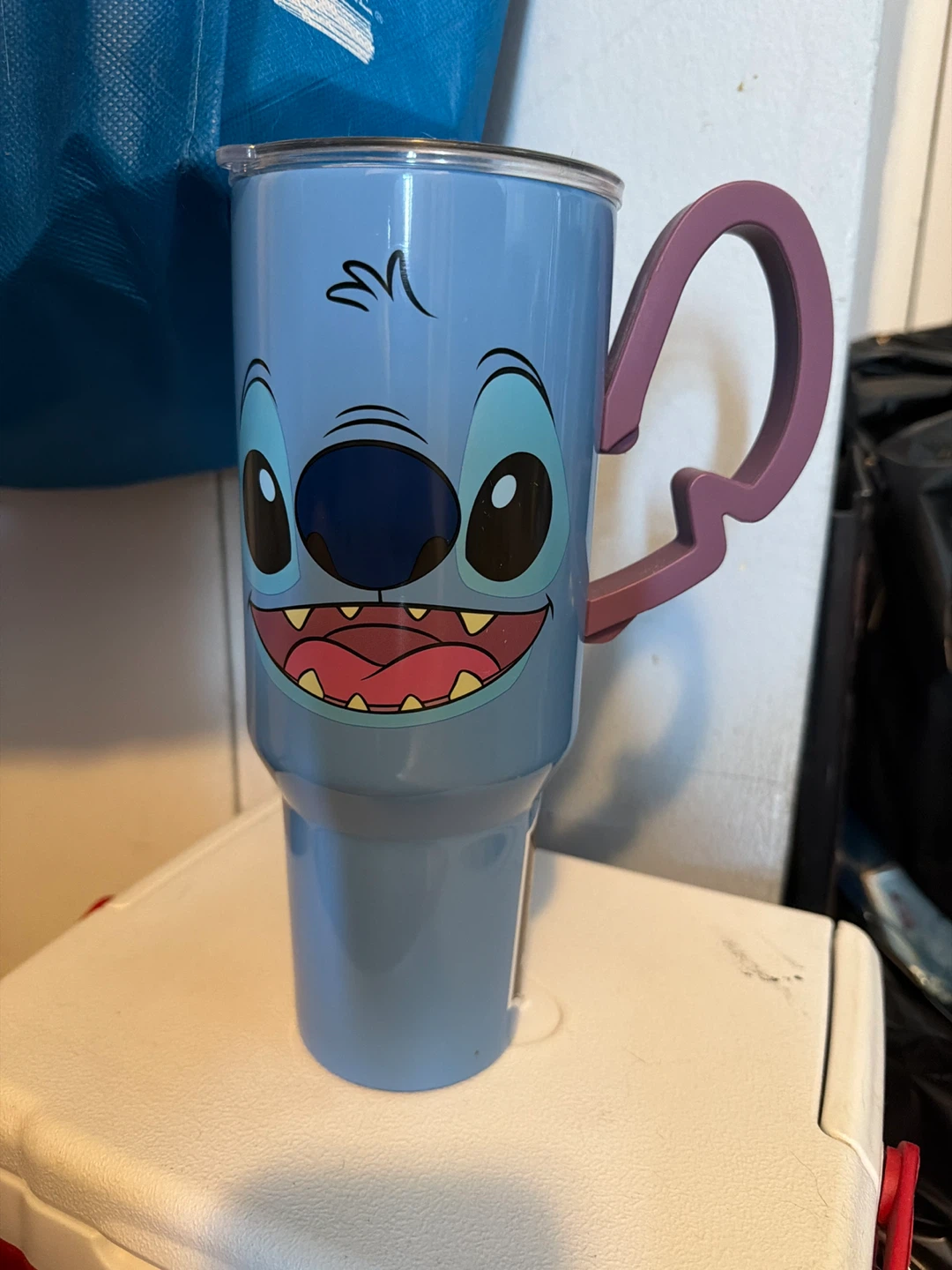Light blue tumbler featuring Stitch's face and a purple handle. It's made with double-wall vacuum insulation using 18/8 food-grade stainless steel. Keeps drinks hot for 6 hours and cold for 12 hours. It's reusable and BPA-free! Never used
