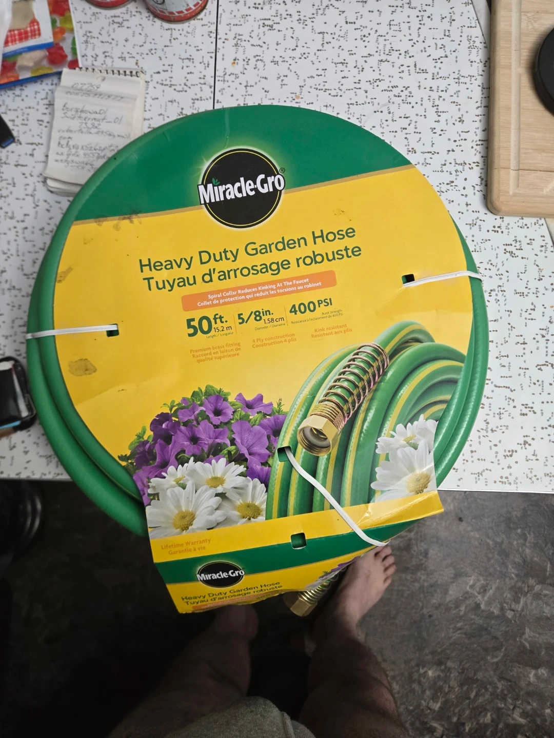 60Selling a Miracle-Gro Heavy Duty Garden Hose. It's 50 ft long and 5/8 inch diameter. The hose has a spiral collar that reduces kinking at the faucet and is kink resistant. It also features a premium brass fitting and 4-ply construction for added durability