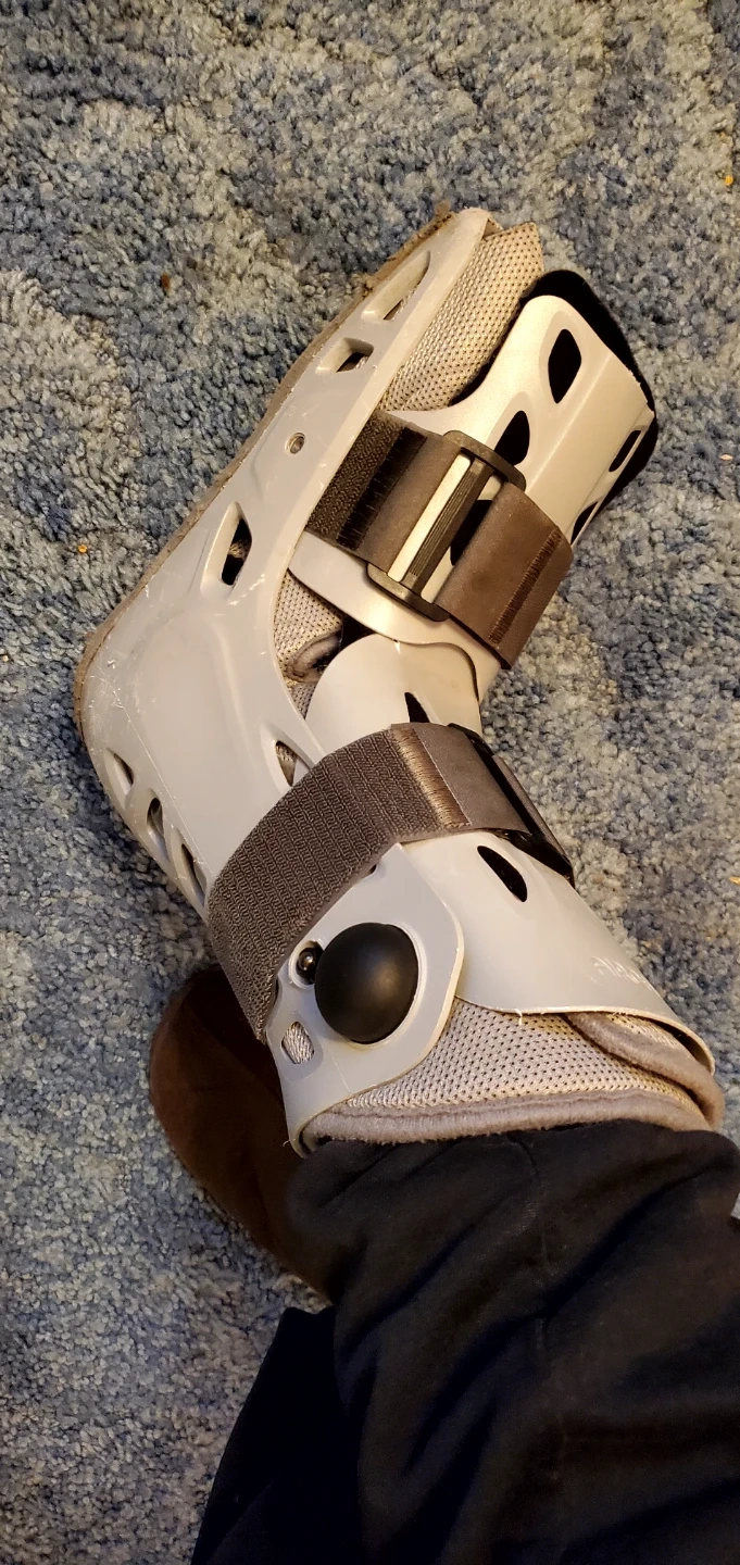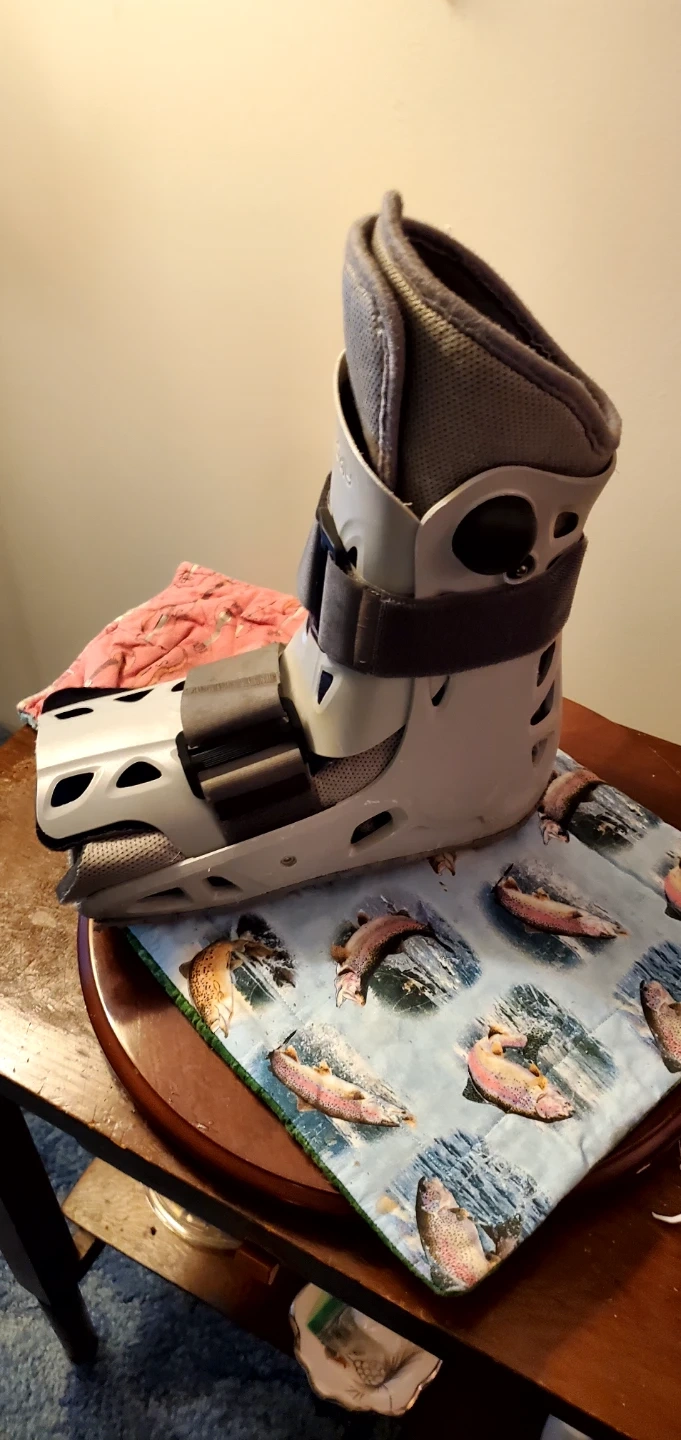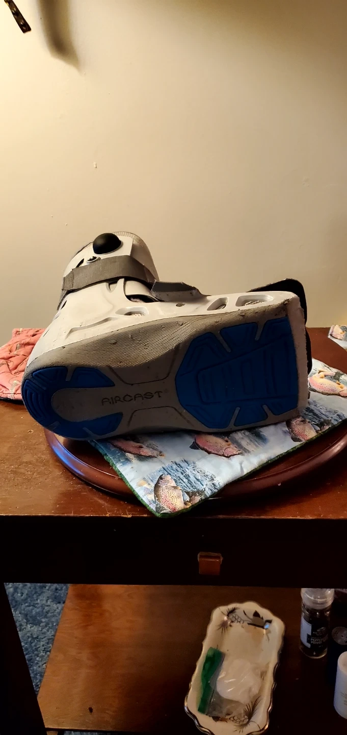 This is an Aircast walking boot. It's grey and white with adjustable straps. It's designed for support and immobilization. Medium size.