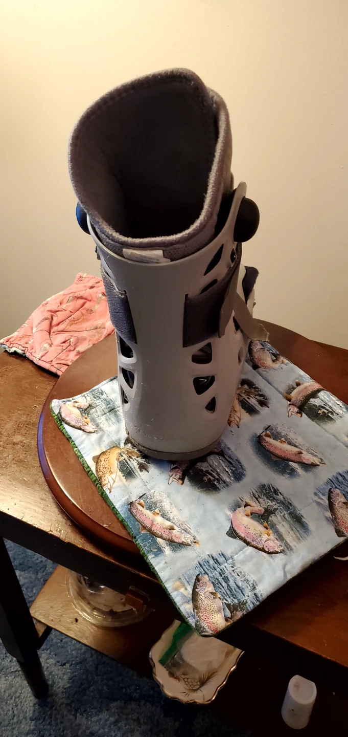 This is an Aircast walking boot. It's grey and white with adjustable straps. It's designed for support and immobilization. Medium size.