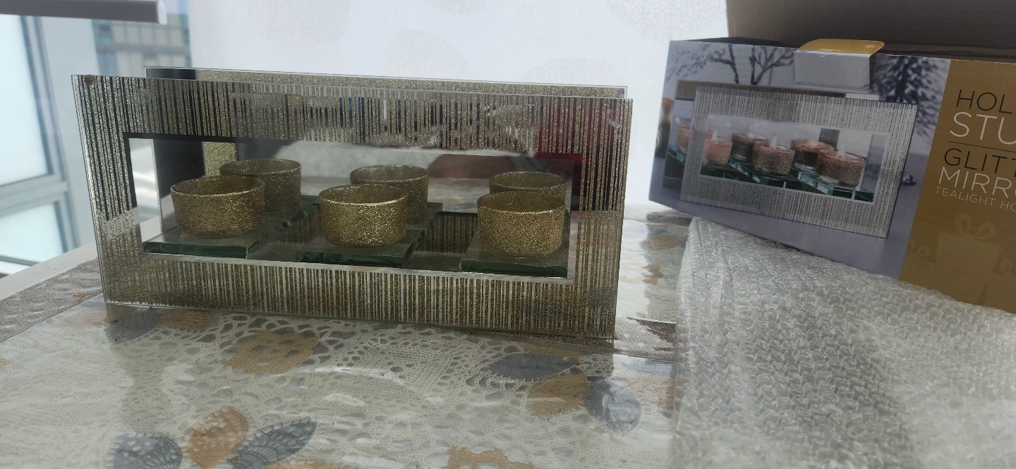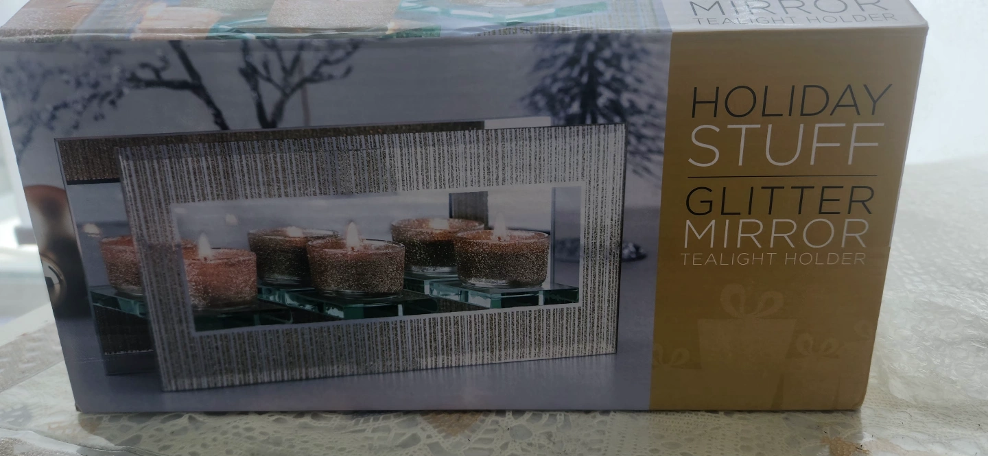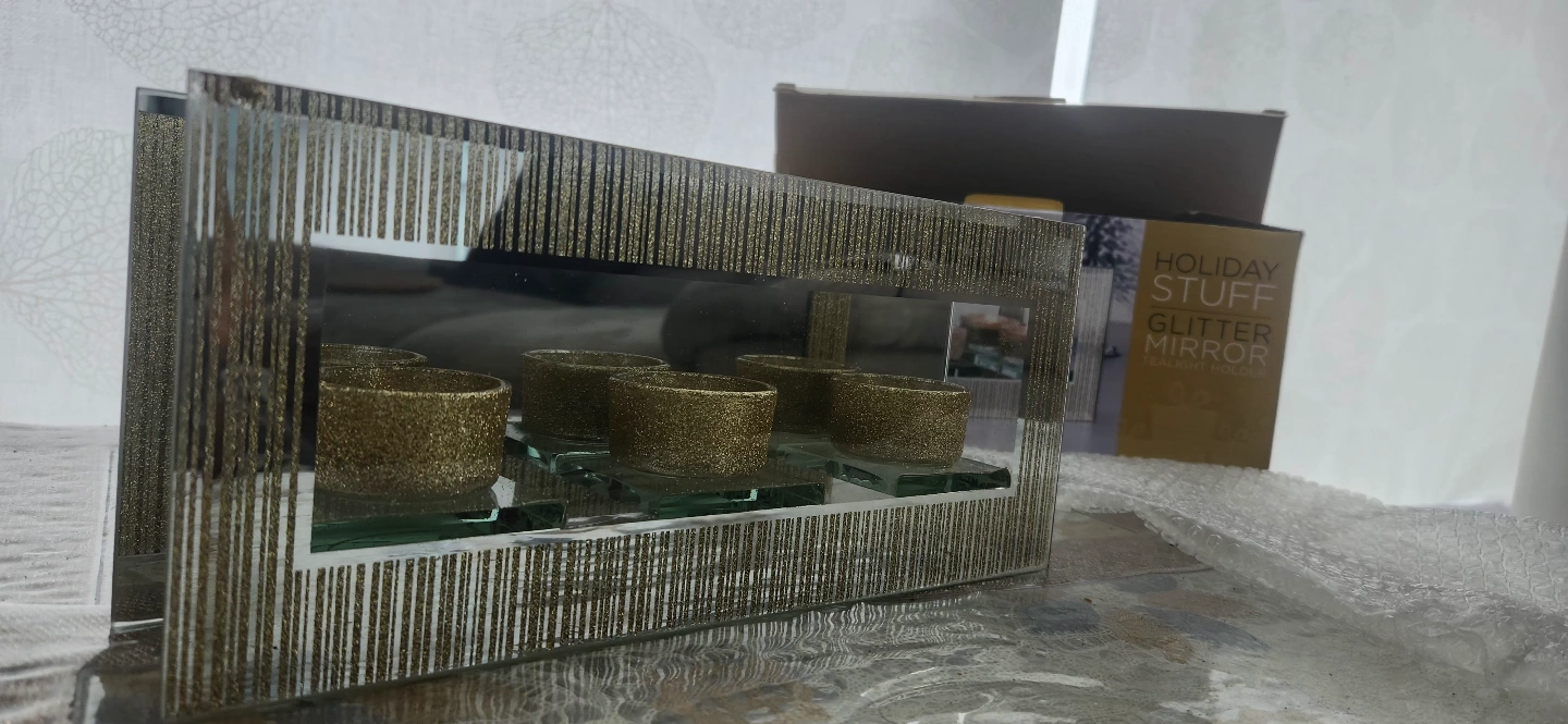 18Mirrored centre & Gold glitter detailing. Holds 3 tealights *Comes in original box