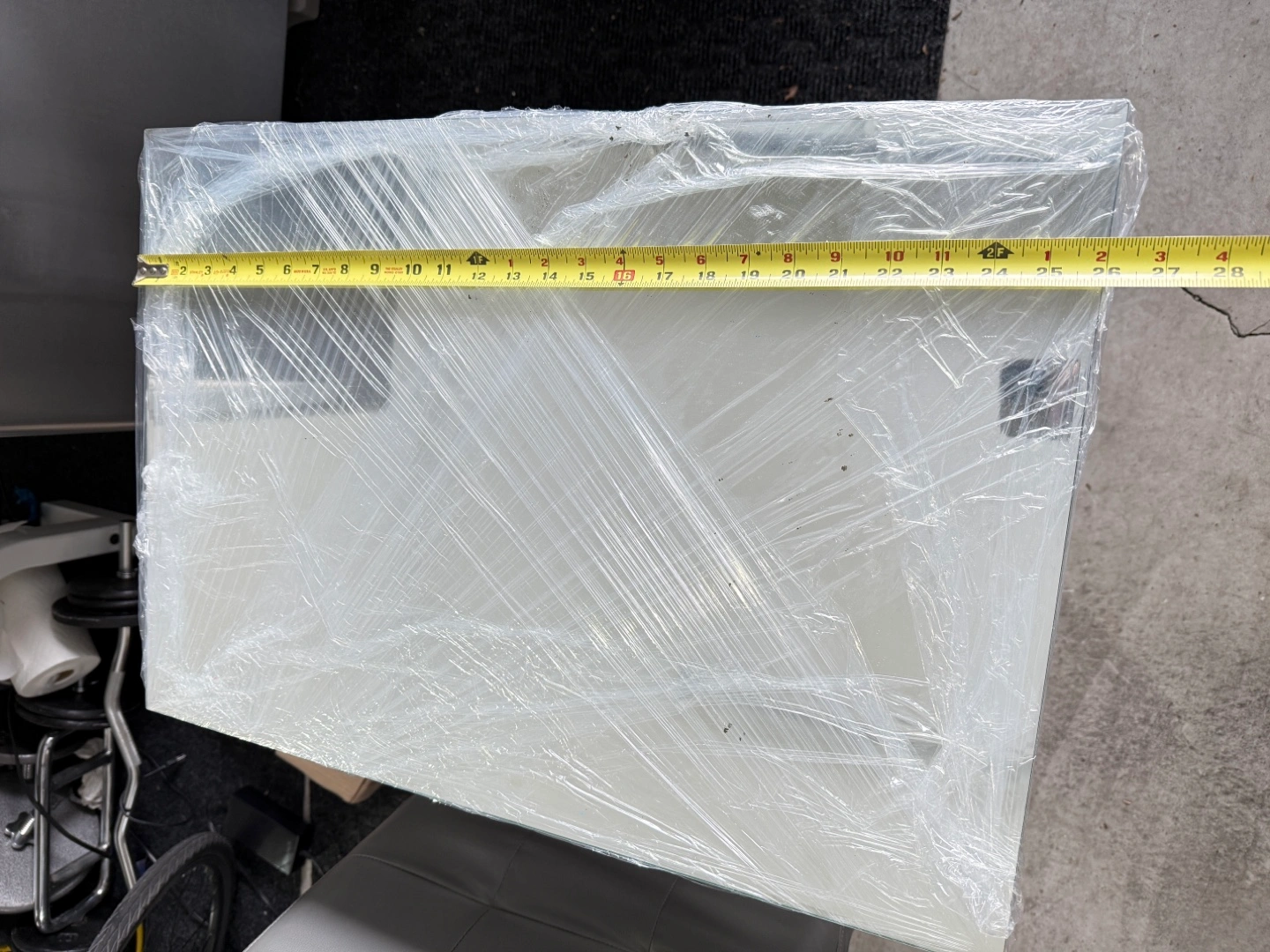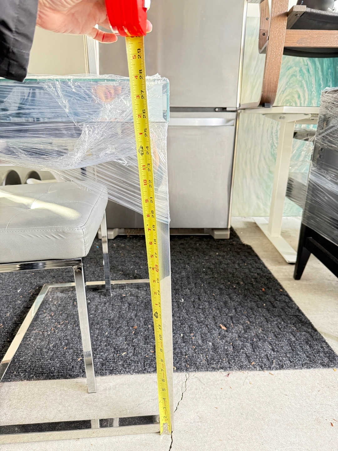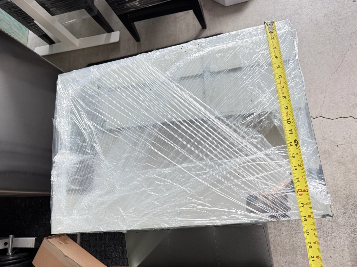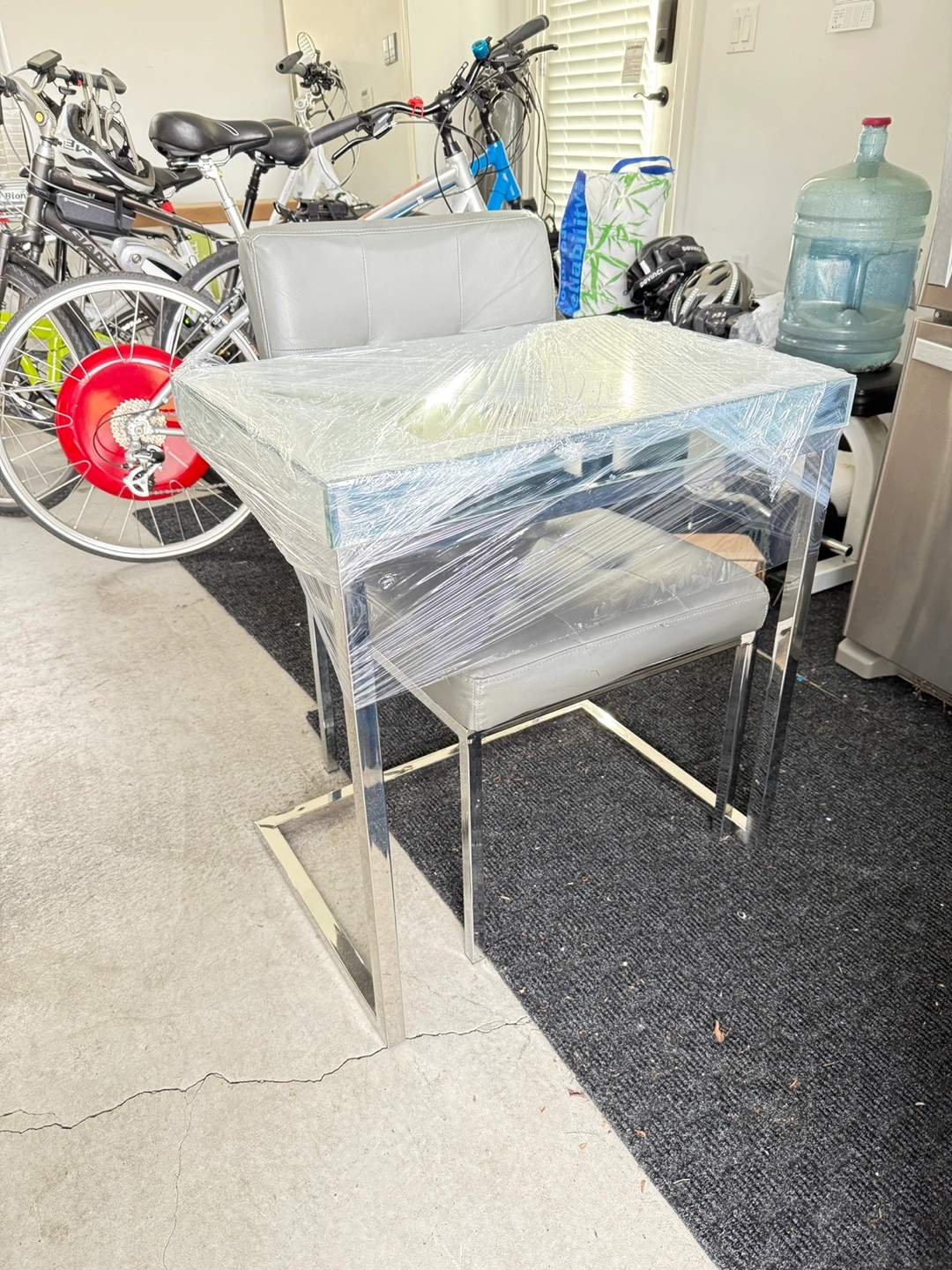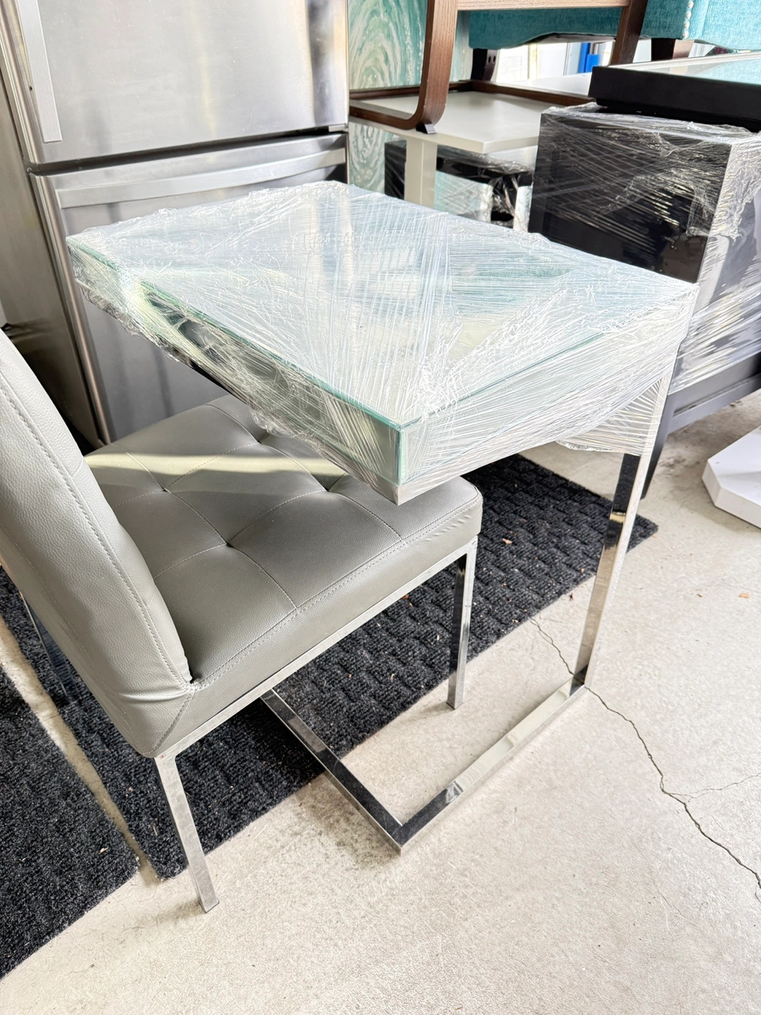 471Selling a stylish side table with a glass top and a matching chair. The table is about 28 inches tall, 26 inches wide, and 18 inches deep. The chair has a grey seat. Perfect as an accent piece in any room!
