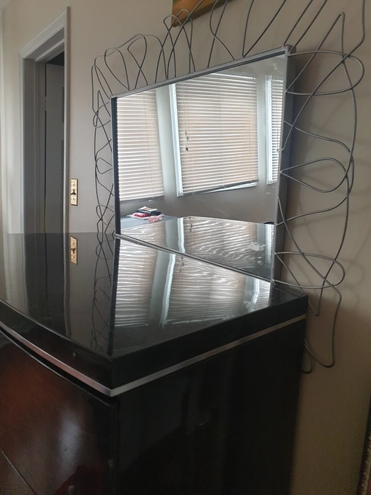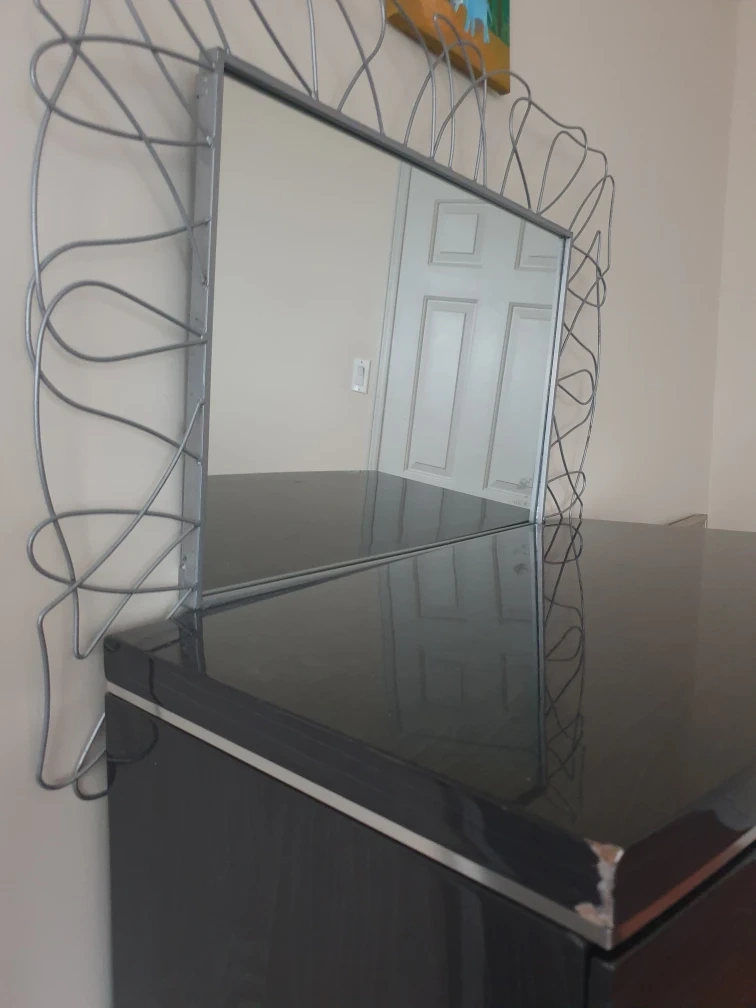 Selling a mirror with a unique wire frame design. It's in good condition and would add a stylish touch to any room