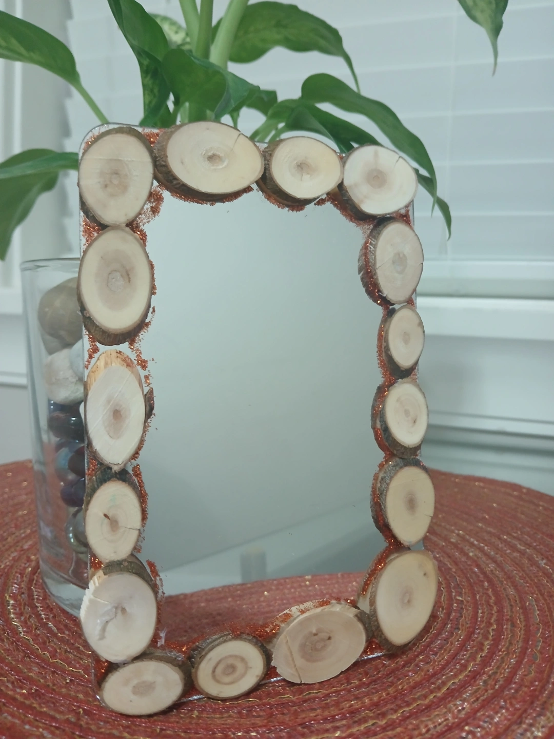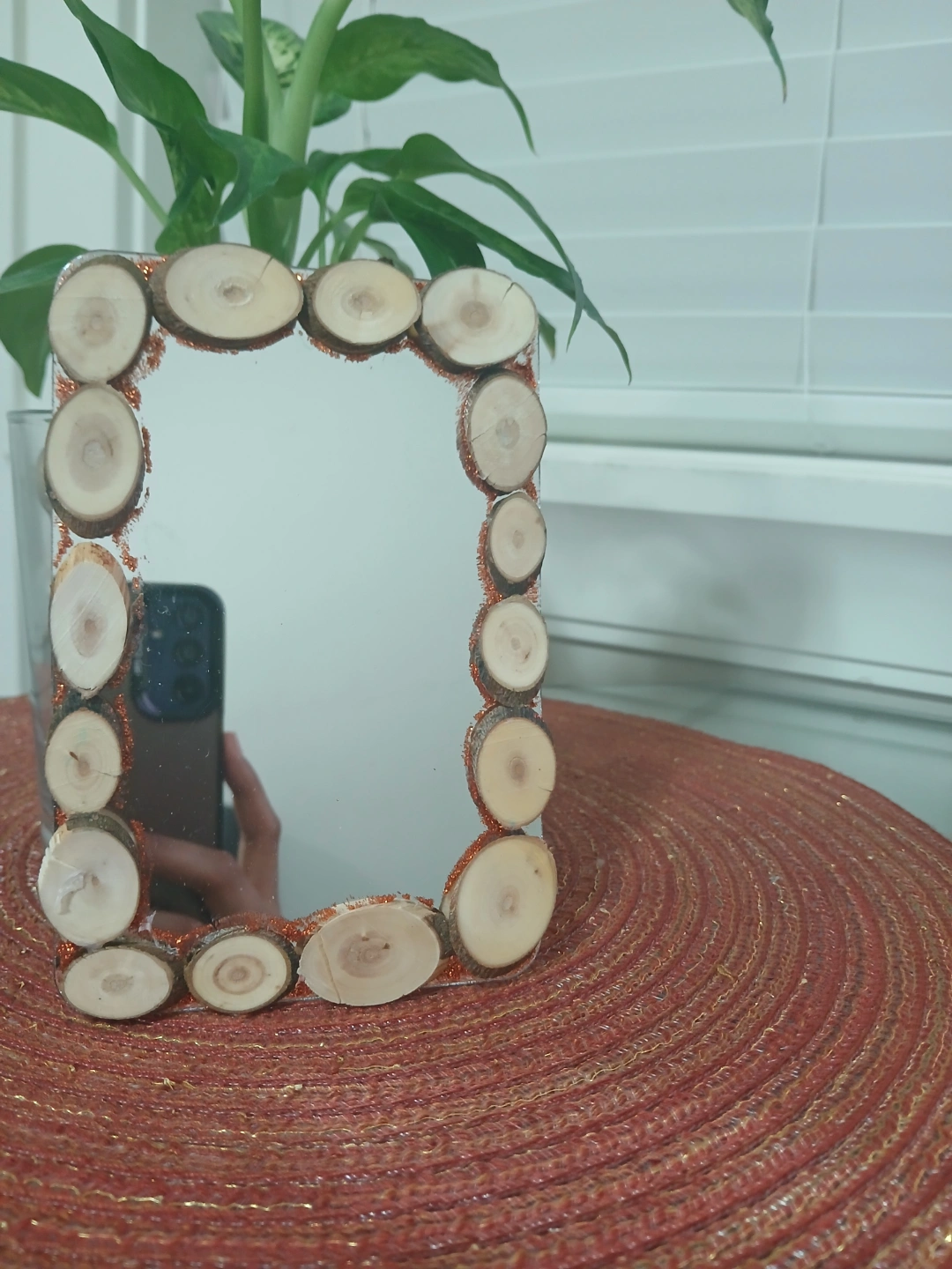 60Mirror in a rectangular shape. Wooden frame with wood slice details. The frame is decorated with some type of sparkling material. Sticking mirror with a sticker at the back. Stick this mirror in your home to create a relaxing and inviting space.