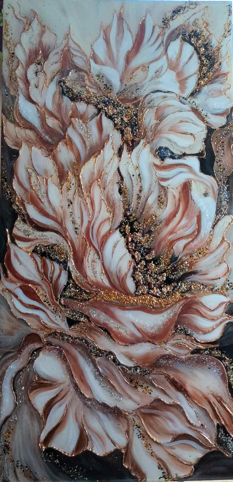 This painting is created in a contemporary style. I spent quite a long time working on it, pouring care and soul into every brushstroke. A mirrored artwork featuring a floral composition, painted with acrylics and embellished with mirror fragments. Canvas size — 20×40 in. This piece fits beautifully into a modern interior, adding light, texture, and a refined atmosphere.