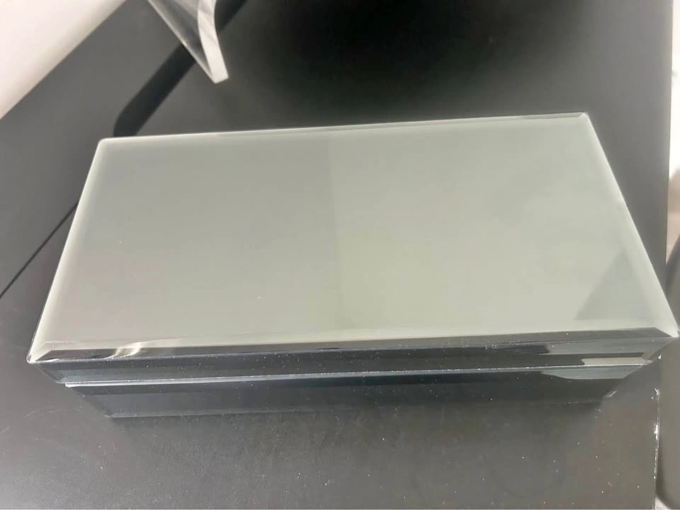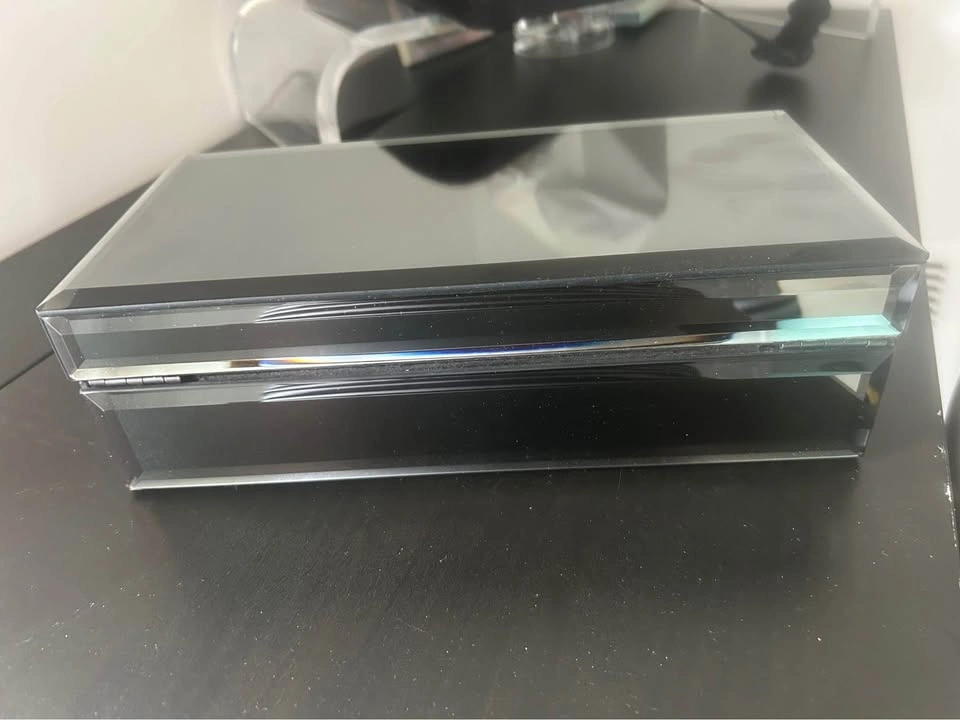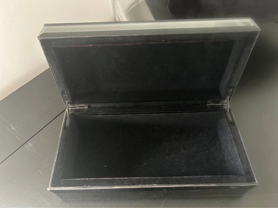 10Mirrored decorative box with velvet interior. No chips or cracks. Perfect for storing jewelry or keepsakes or even remotes. 10 inches long by 5 inches wide.