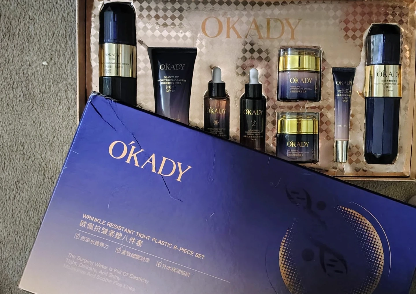 This OKADY 8-piece set is designed for wrinkle resistance and skin tightening. It includes a toner, facial cleanser, serums, and creams. The products aim to provide elasticity and moisturize the skin, soothing fine lines.