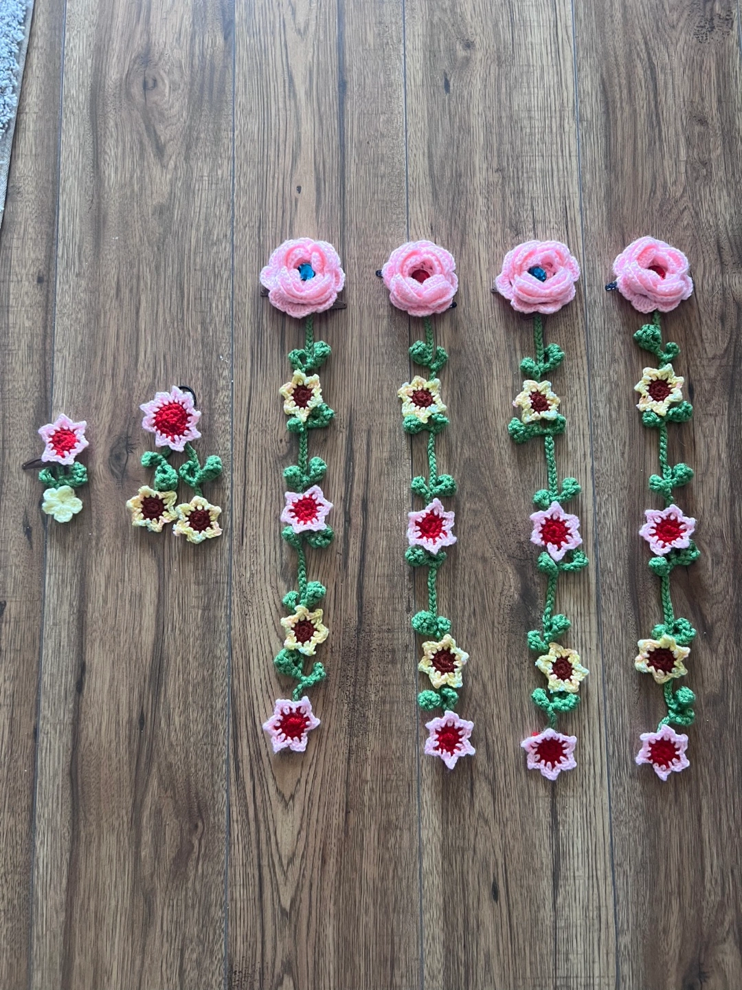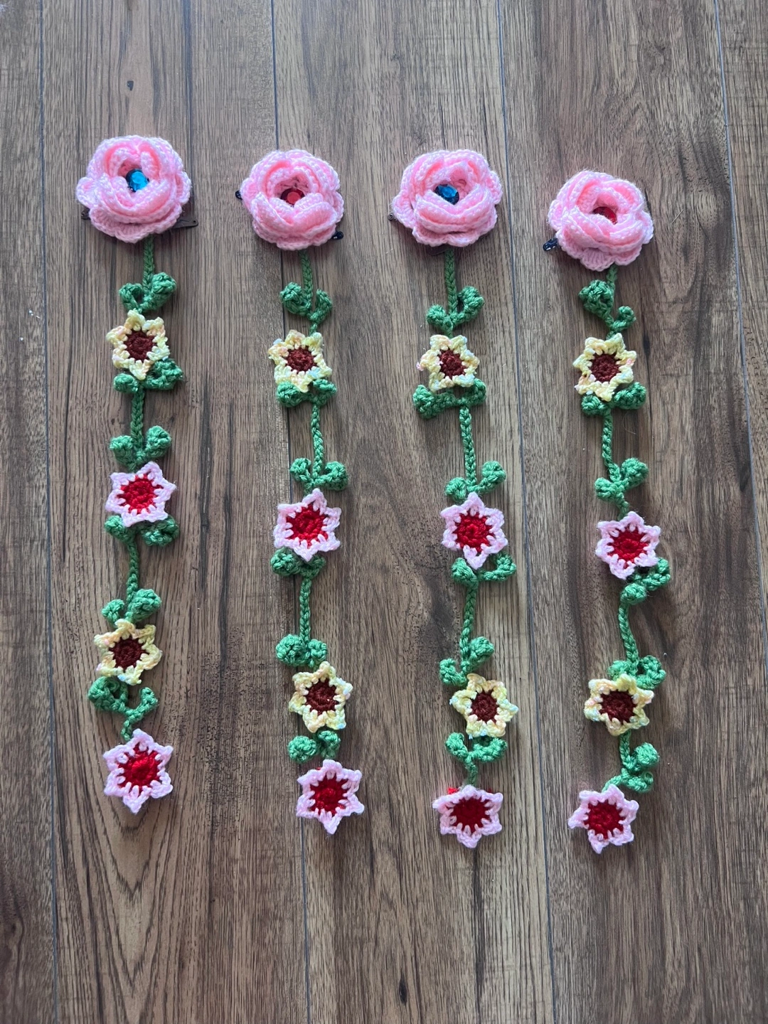 Selling a handmade crocheted flower hair clip . It features a string of colourful crocheted flowers in pink, yellow, and red with green leaves. Perfect for adding a touch of handmade charm to your hair for any occasion can be customised to length and as per request…