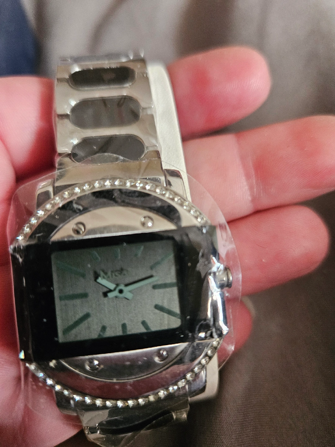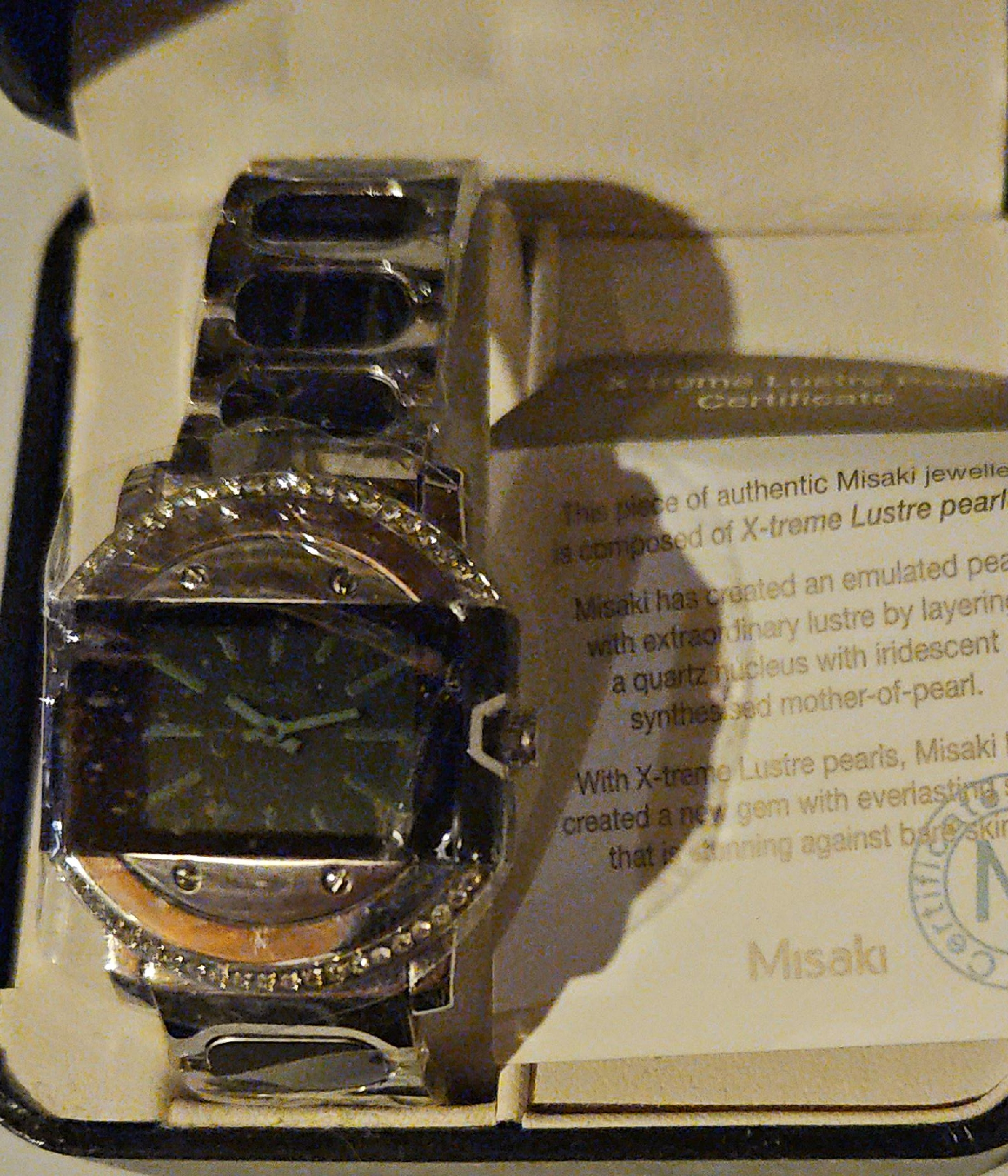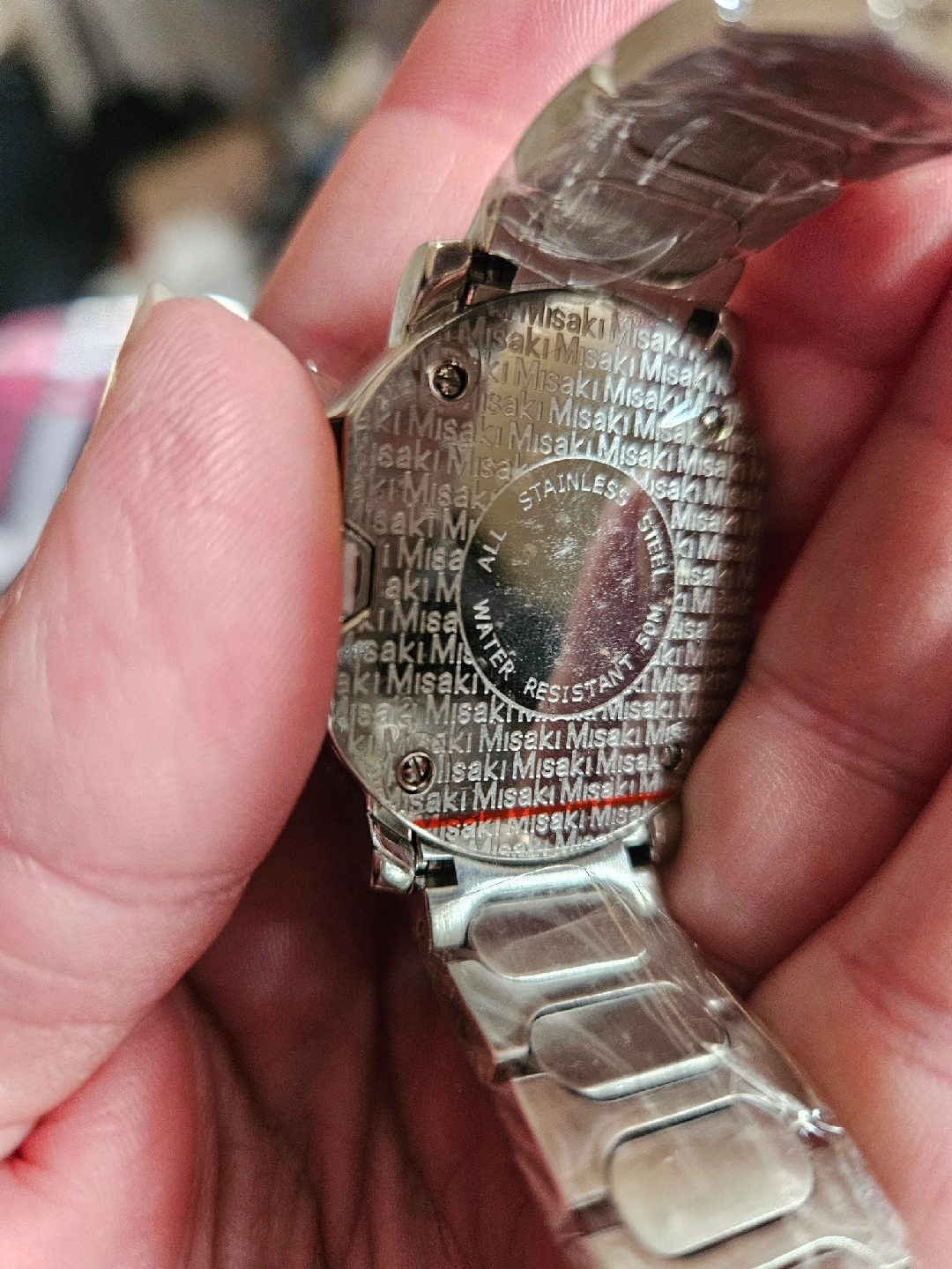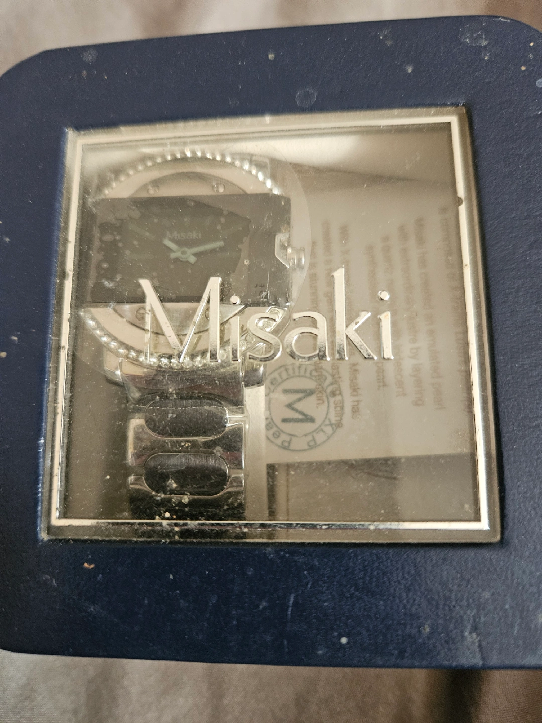 108Selling a Misaki women's watch. It features a stainless steel band and a square face with crystal accents. The back of the watch is engraved with "Misaki" repeatedly. It comes with its original box and certificate! Needs a new battery.