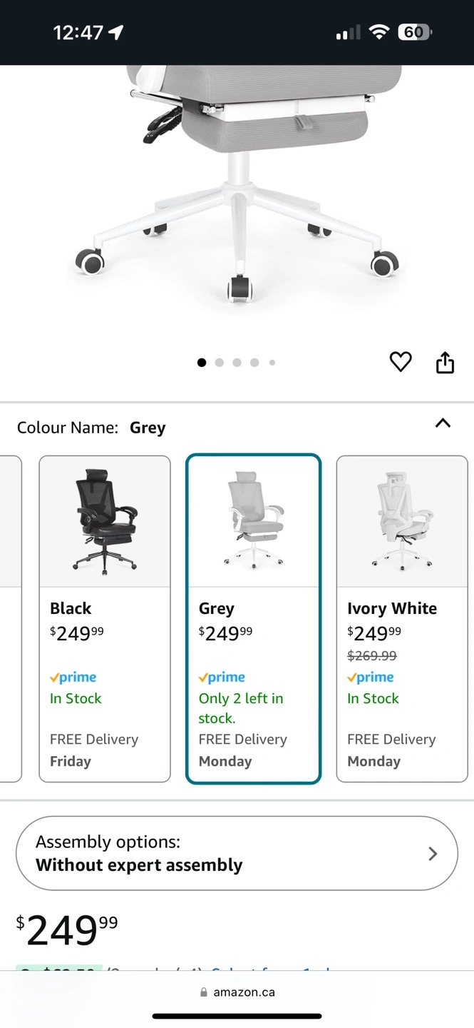 15* Original price 250C$ plus tax: 282CAD$ * Just asking 199CAD$ * Just used it a few times * Reason for selling: Not using it a lot, Need to go to the office very frequently so not using it. * Very comfortable * Final office chair for everyone. Adjustable office chair with height, recline, and lumbar support. Features a footrest and breathable mesh back. Grey colour.