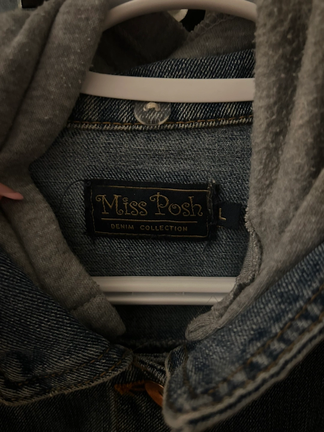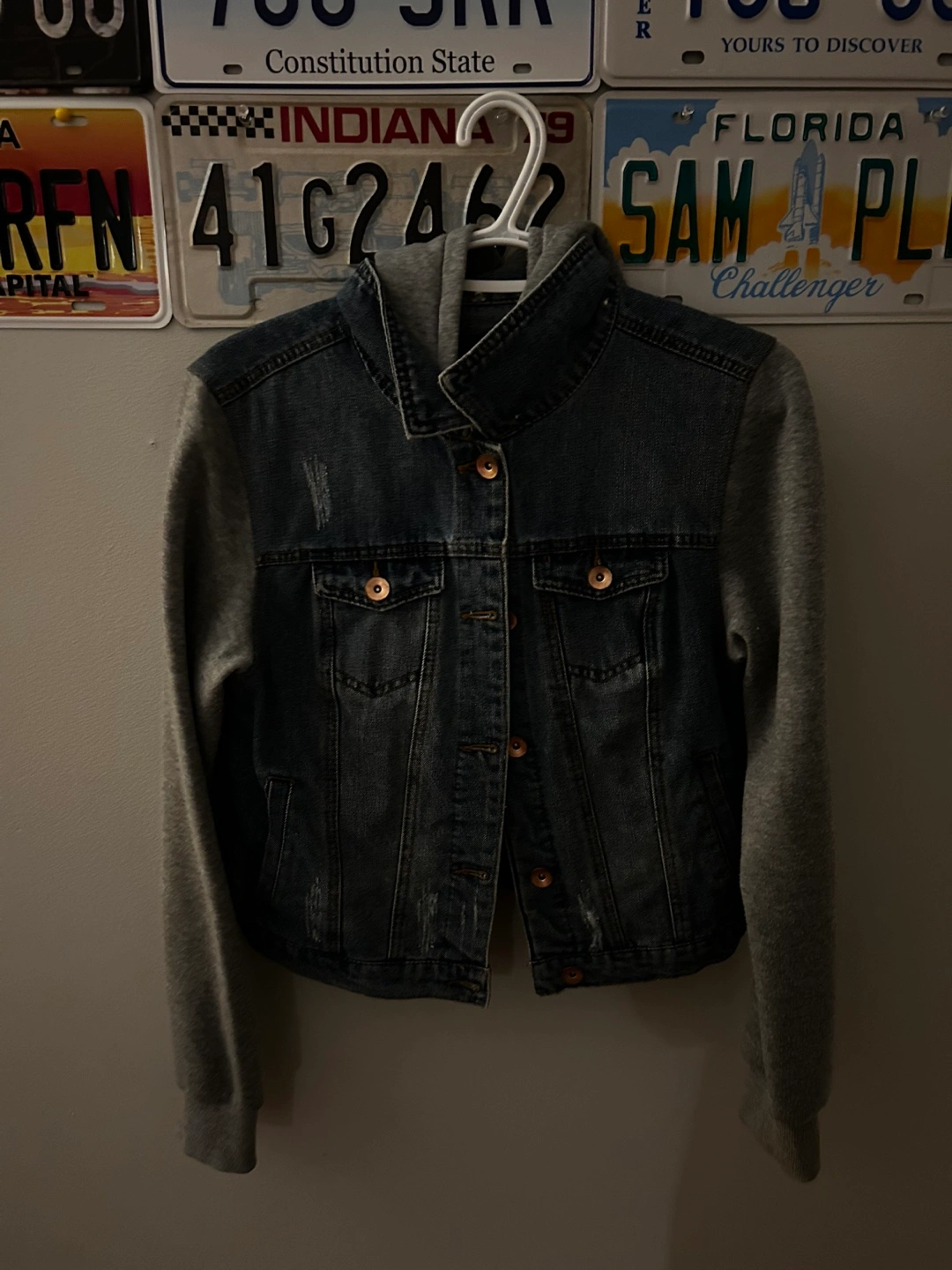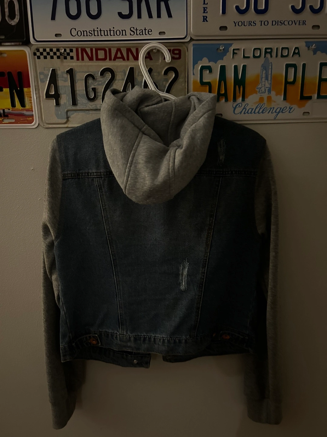 Denim Jacket – Size Large Denim body with sweater sleeves and hood. Size Large (kids). Good condition – no stains or damage.