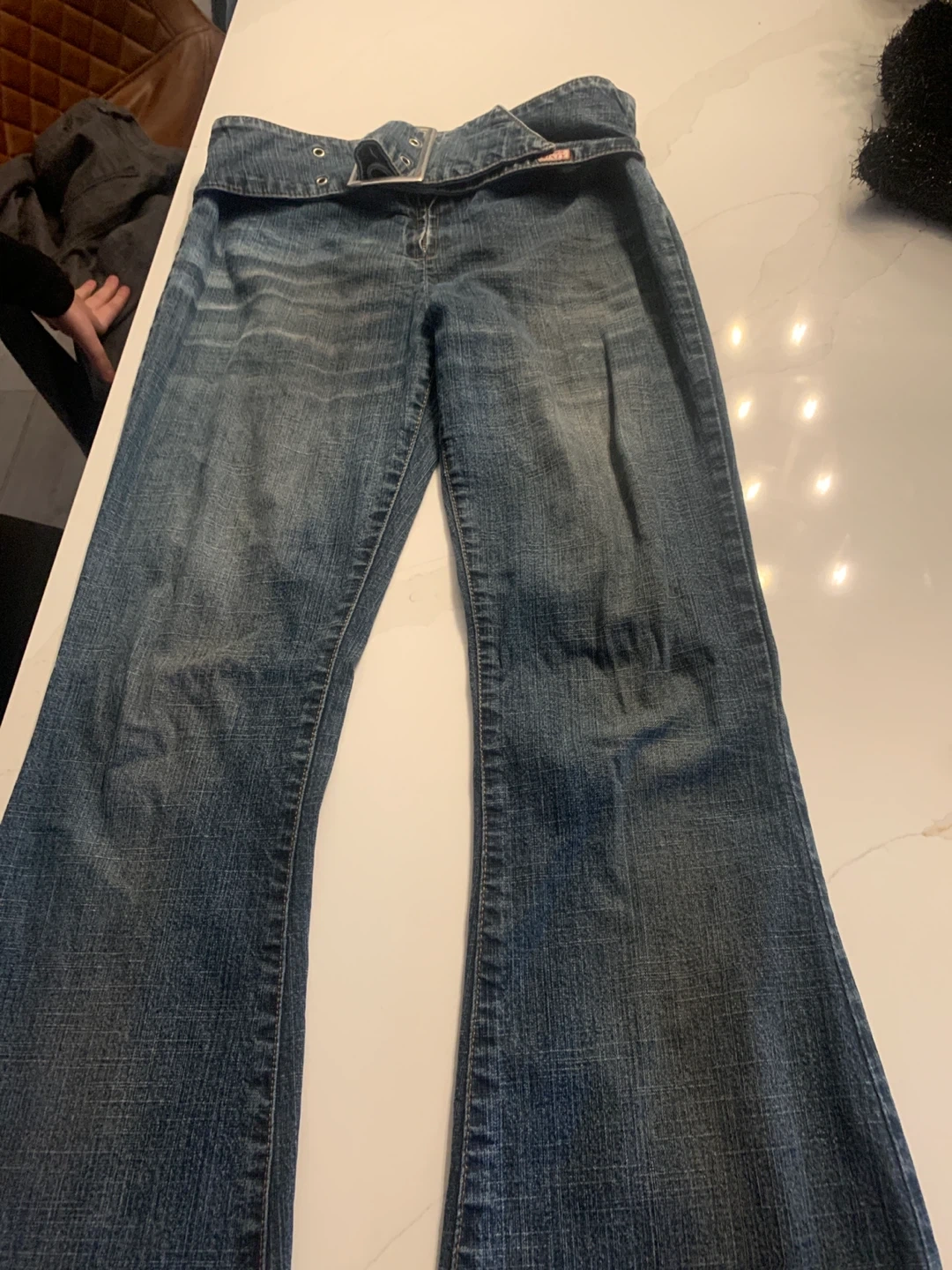 25Selling a pair of Miss Sixty Basic Italy flare jeans! They're in good condition and have a unique belted waist design. The jeans are a classic denim blue colour, perfect for a retro look!