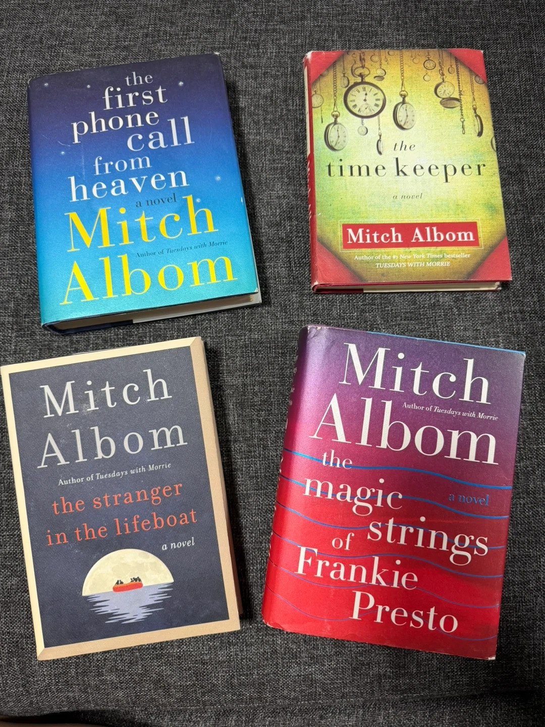60Selling a set of four novels by Mitch Albom! Included are: - The First Phone Call from Heaven - The Time Keeper - The Stranger in the Lifeboat - The Magic Strings of Frankie Presto Perfect for a fan or anyone looking for a good read
