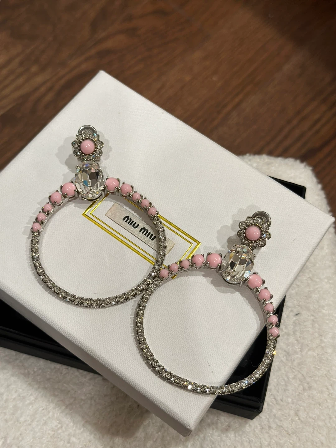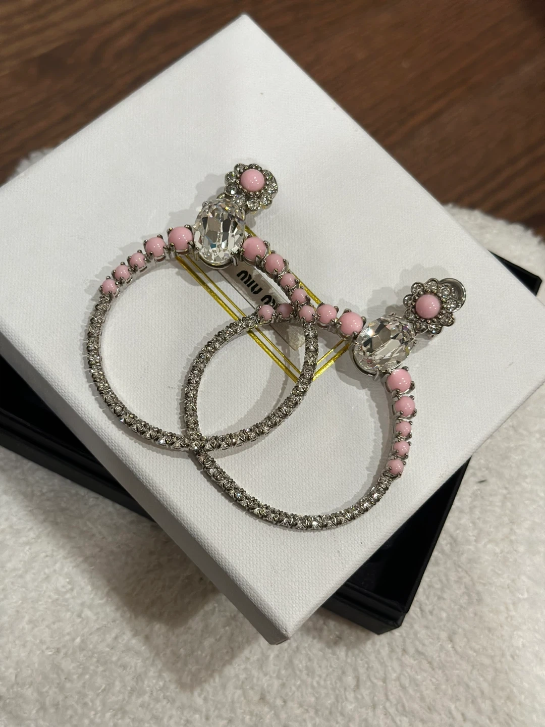 These Miu Miu hoop earrings are so pretty! They feature a silver-tone hoop design with pink beads and crystal embellishments. Comes with the original box