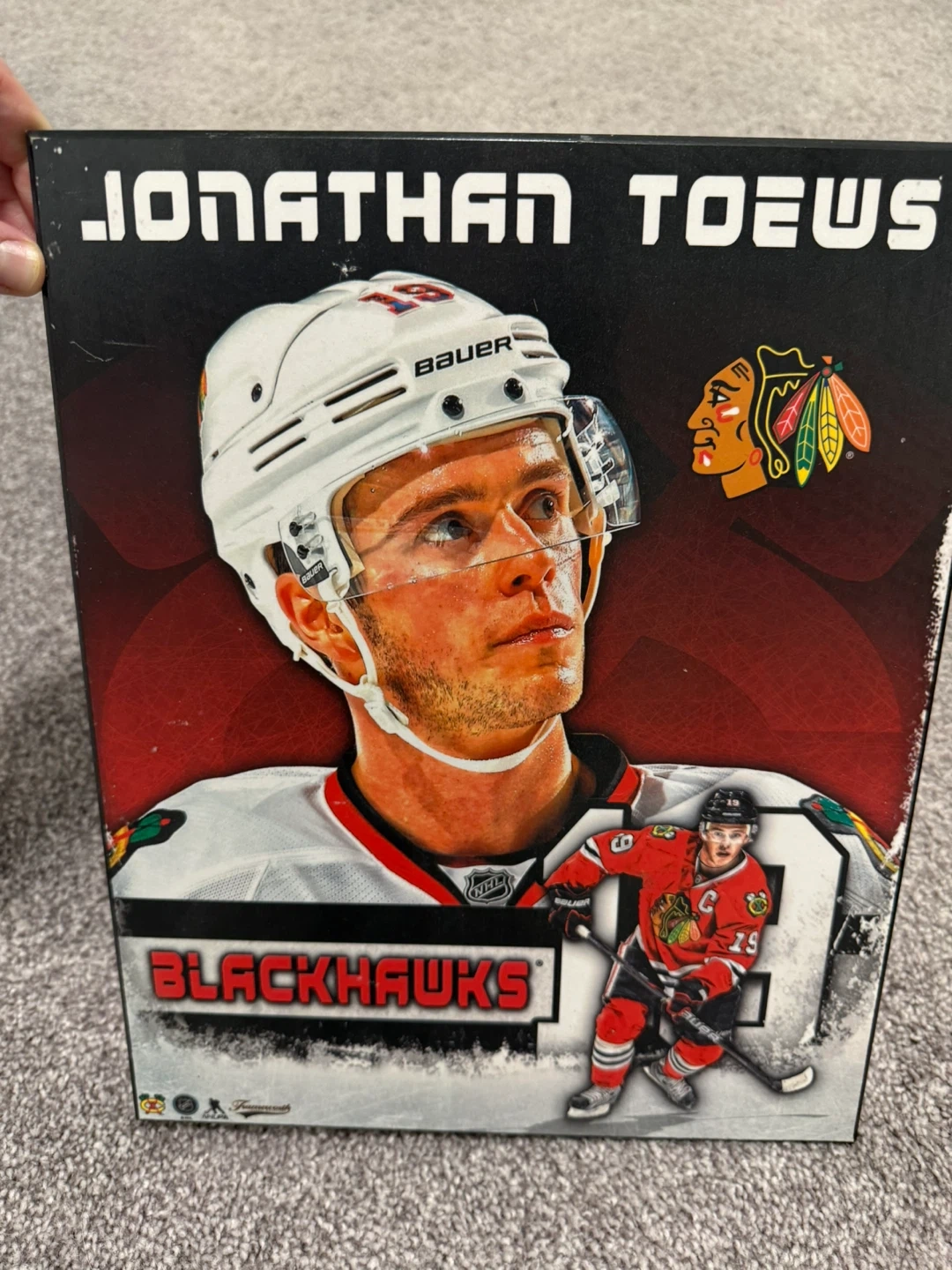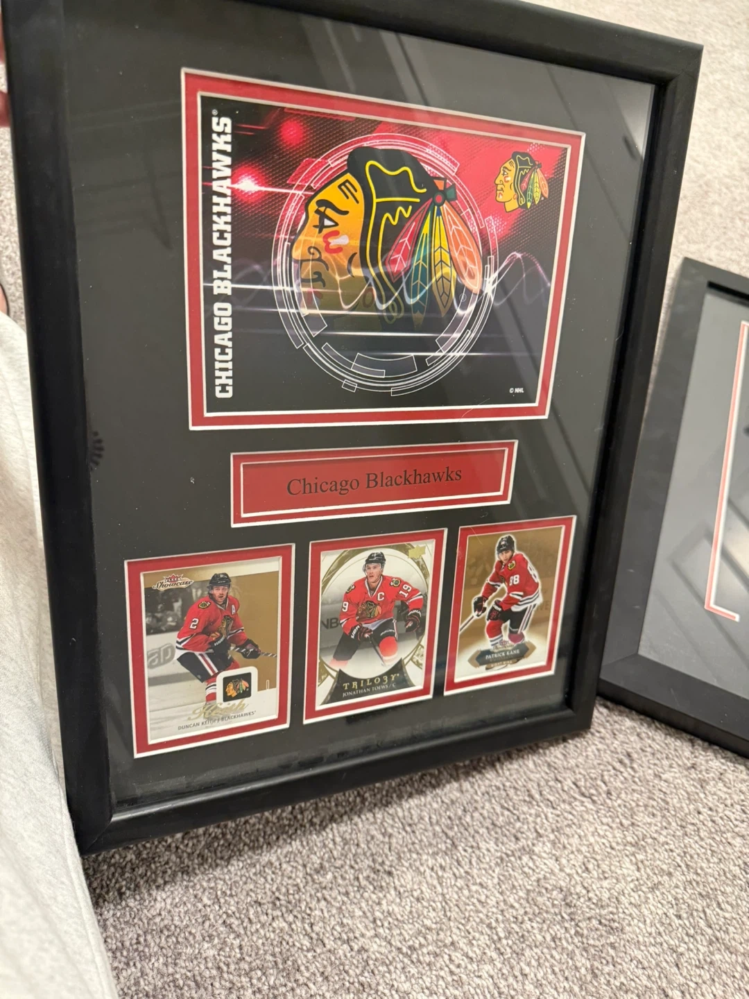 Framed piece showcasing Jonathan Toews and the Chicago Blackhawks. Includes player images and team logos. Perfect for any dedicated fan's collection! $100 for all!