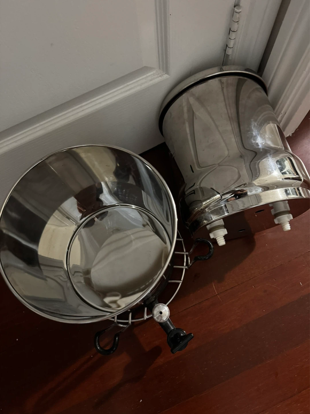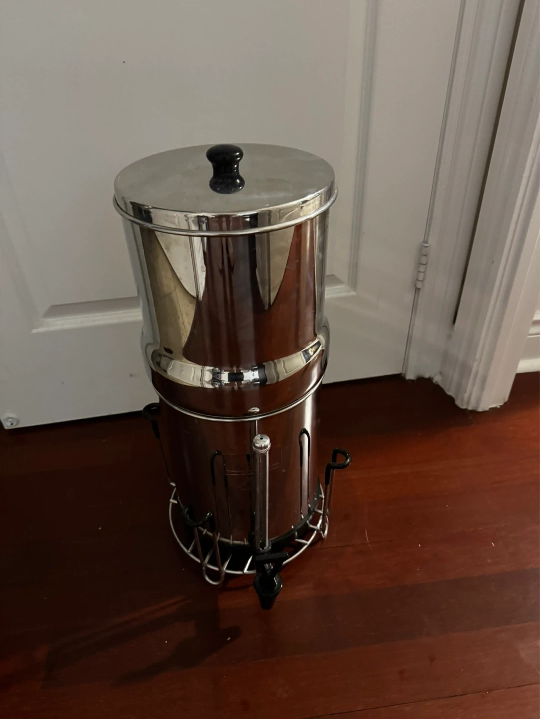 Berkey water filter in like new condition . The Berkey water filter is known for its ability to remove harmful chemicals from water, making it safe to drink. The filter is made of stainless steel and has a capacity of 2.25 gallons. It is easy to use and maintain and is a great way to ensure that you and your family are drinking clean, safe water.