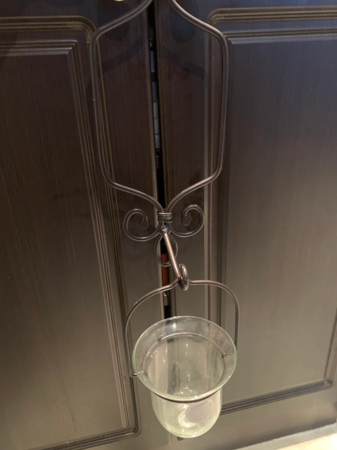 Ornate metal candle holder. Features a hanging design and a clear glass votive. Perfect for adding ambiance to any room.