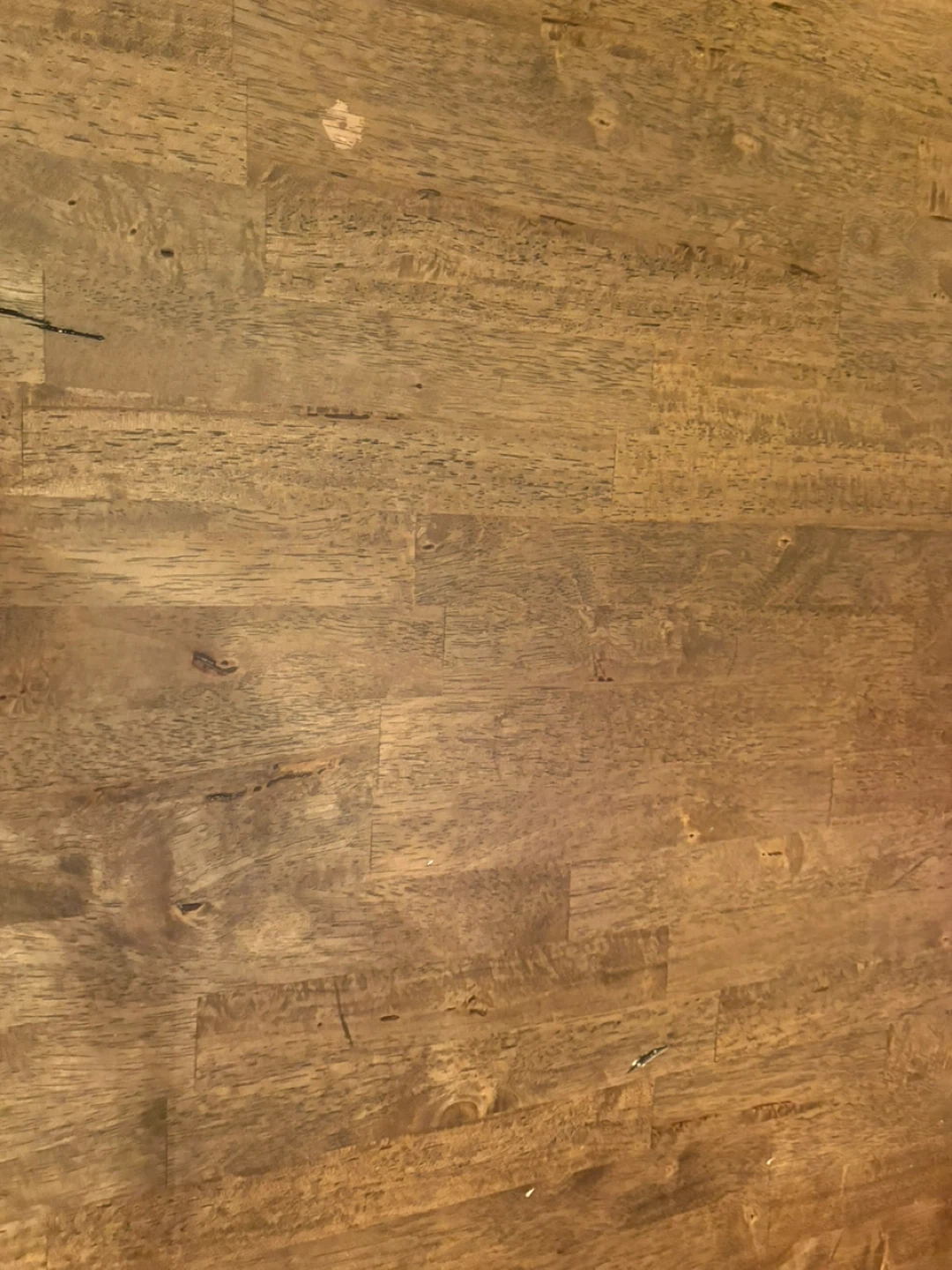 A sturdy wooden dining table featuring a rustic wood top and a black X-shaped leg base. It comes with a matching wooden bench as well as 4 faux brown leather chairs.
