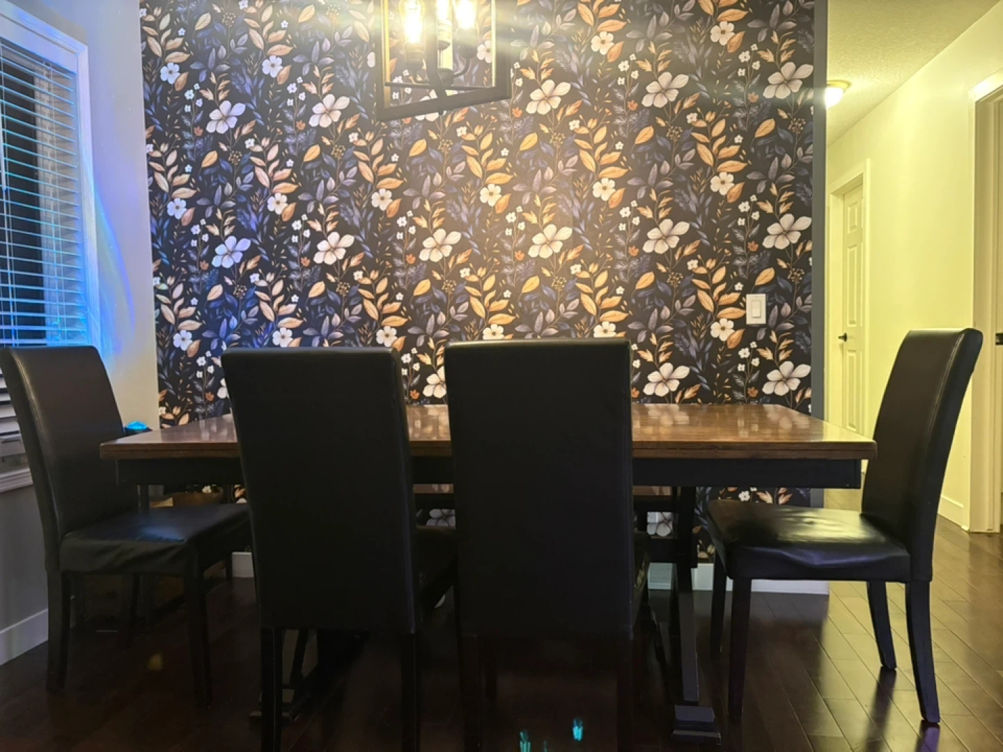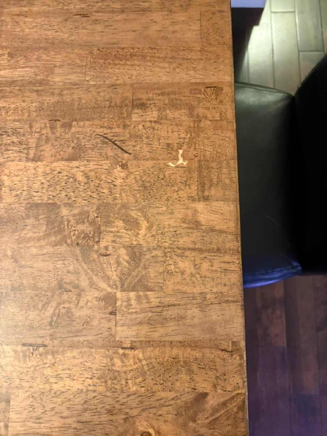 A sturdy wooden dining table featuring a rustic wood top and a black X-shaped leg base. It comes with a matching wooden bench as well as 4 faux brown leather chairs.
