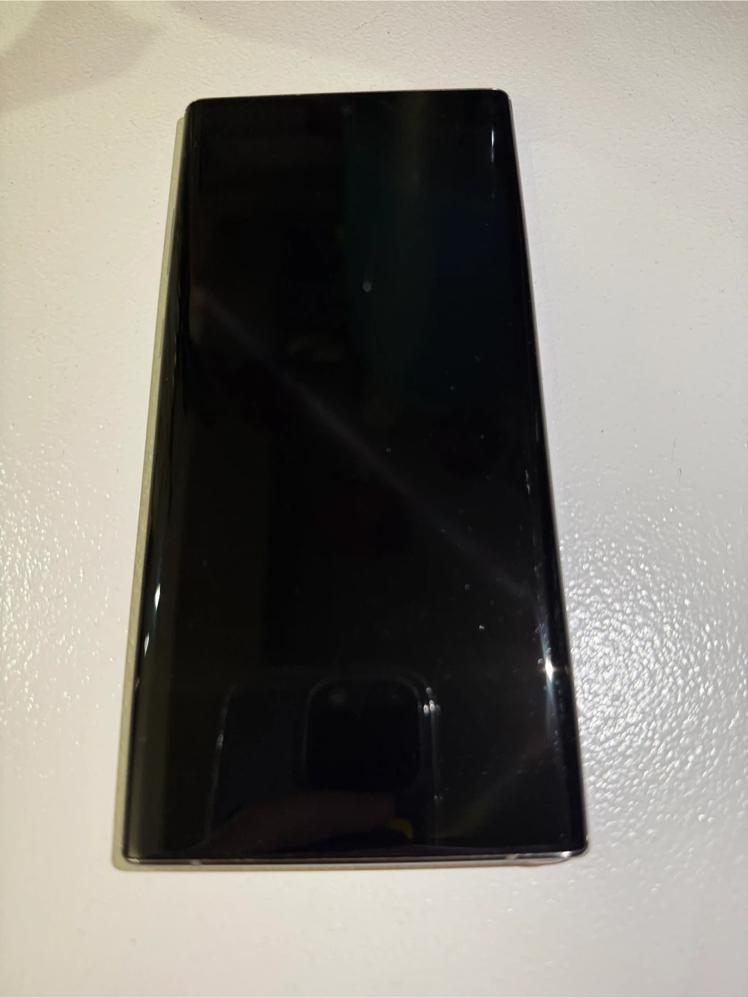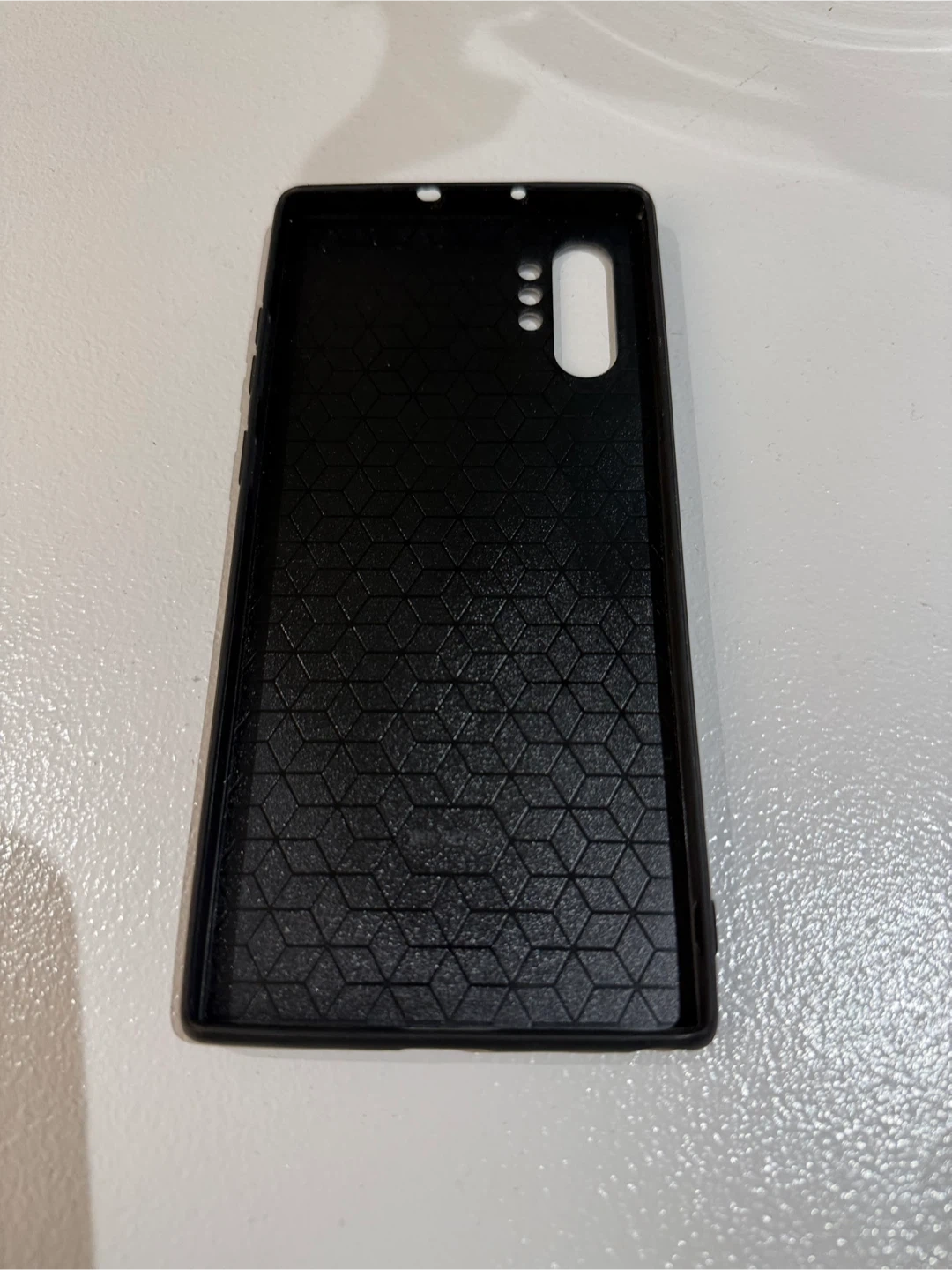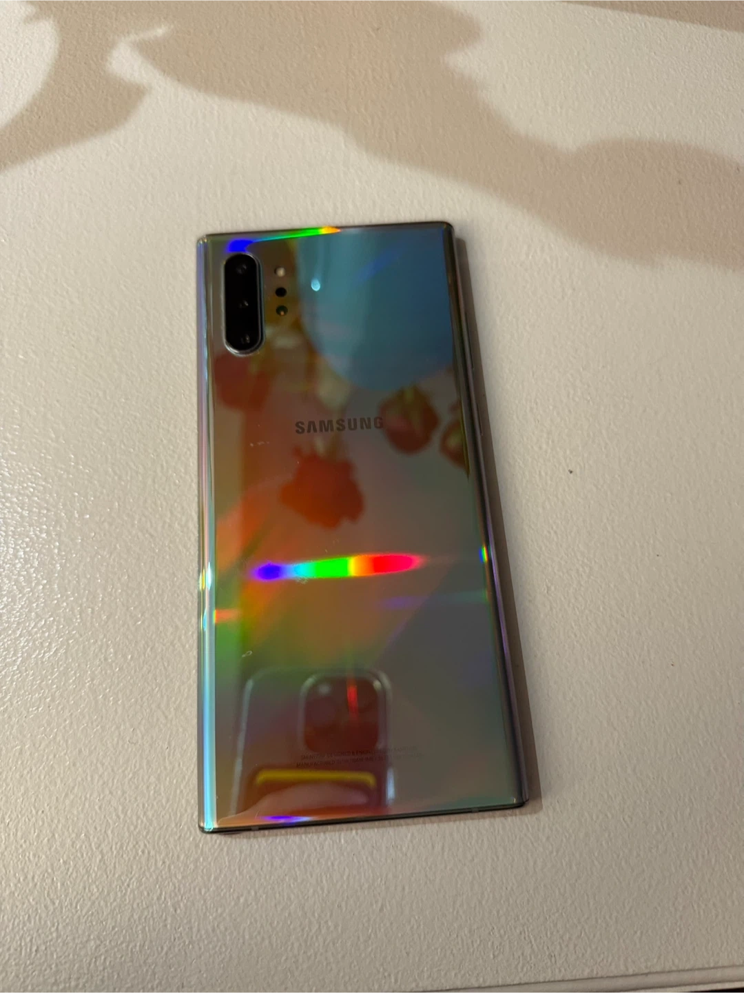 Samsung Galaxy Note 10+ smartphone in prism black. Includes S Pen and a black protective case. This phone's display is edge-to-edge and it features a versatile camera system.