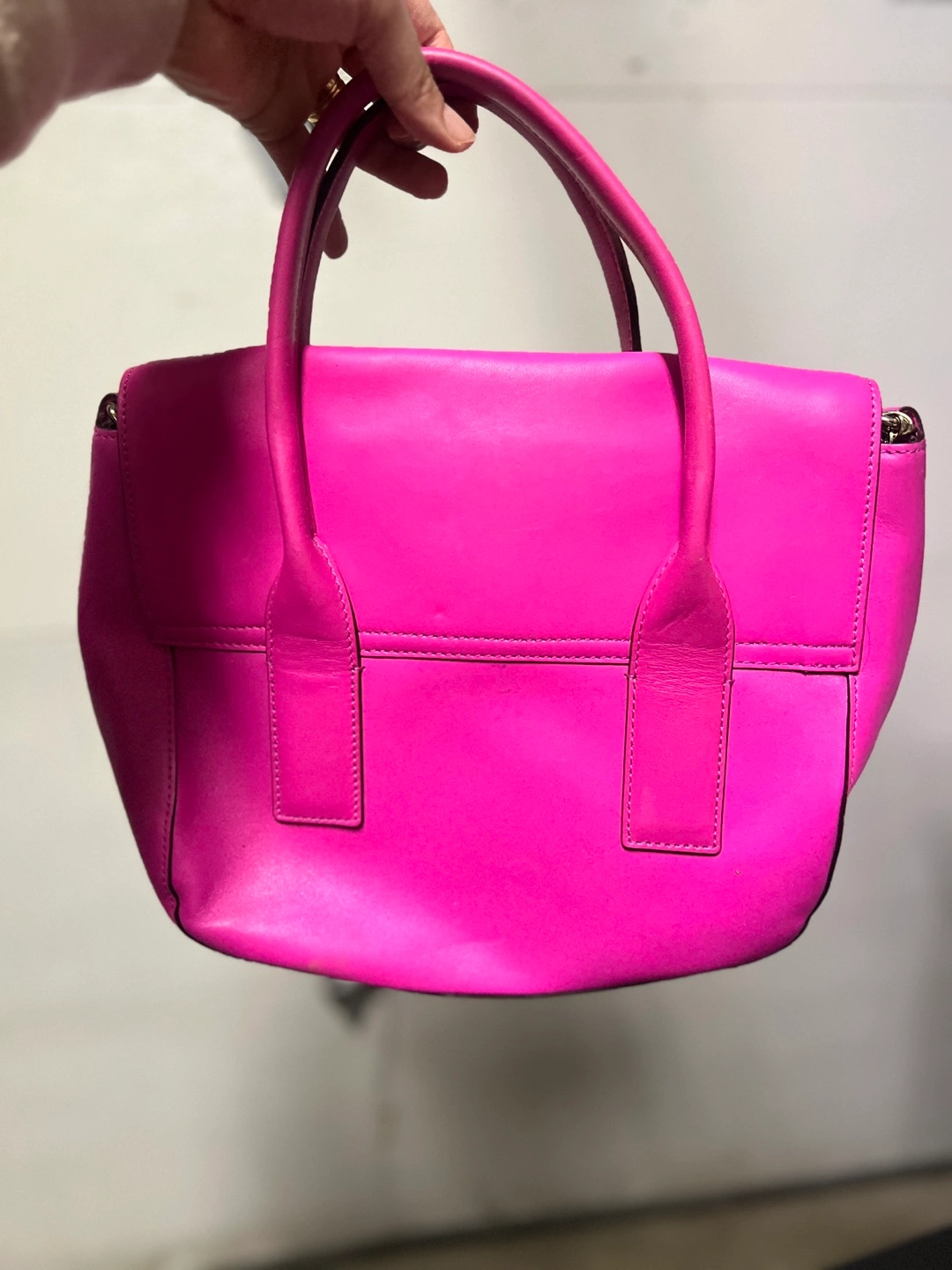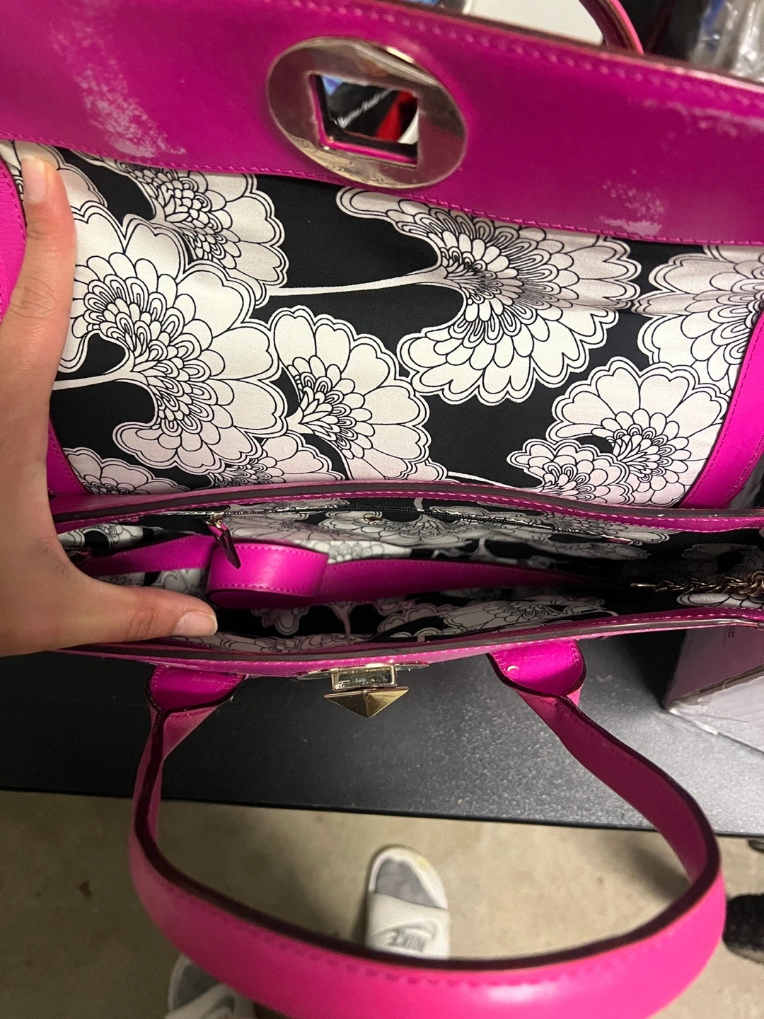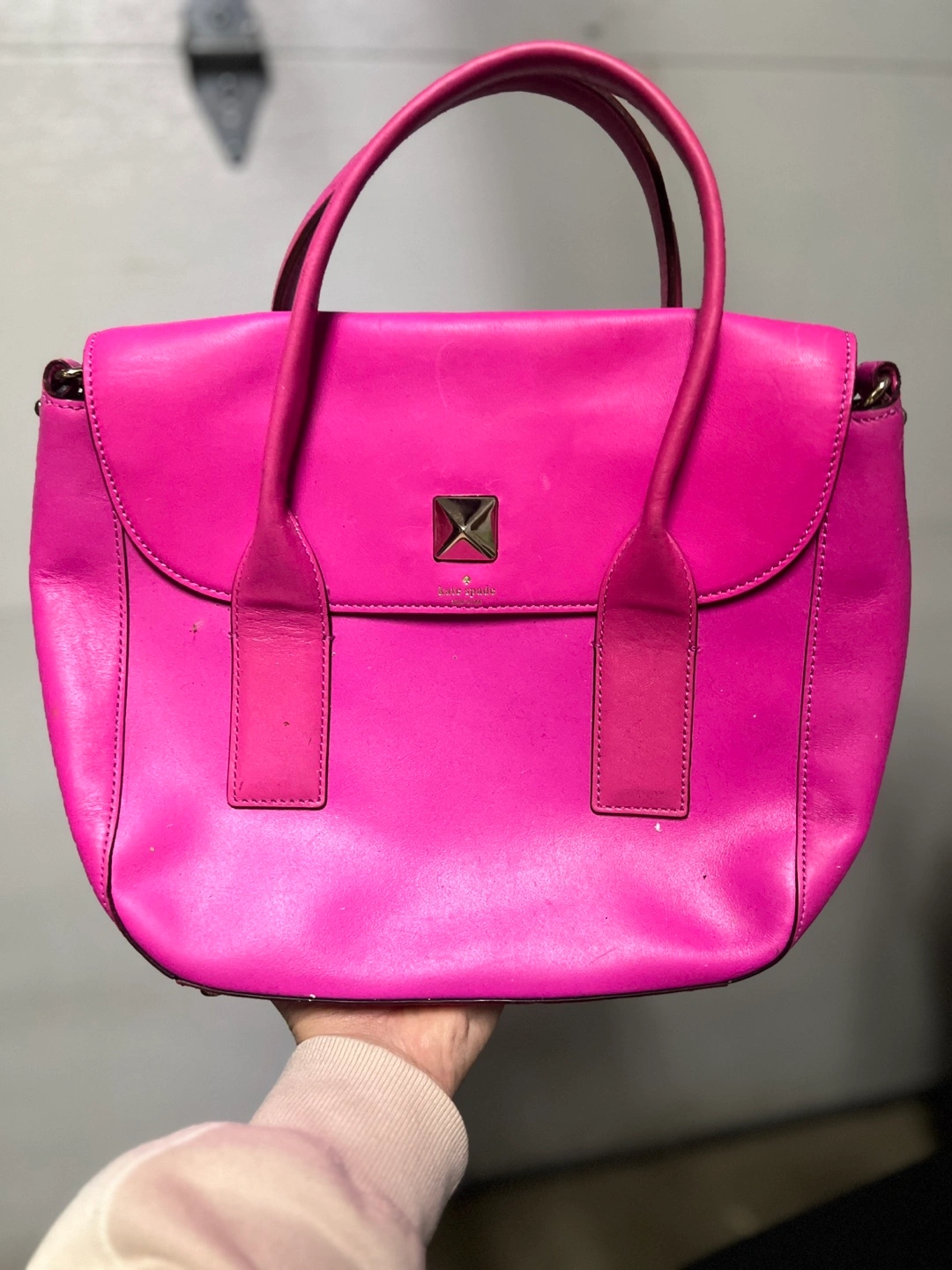 Pre-owned Kate Spade handbag. Hot pink leather. Floral interior. Top handle and shoulder strap. Medium size, perfect for everyday use.