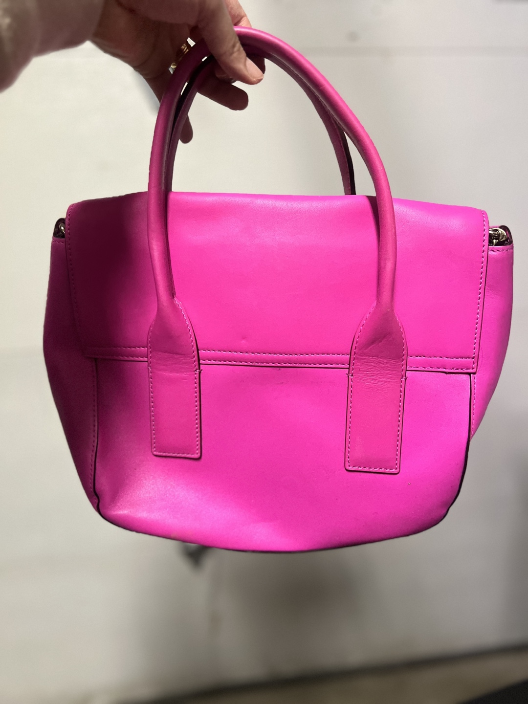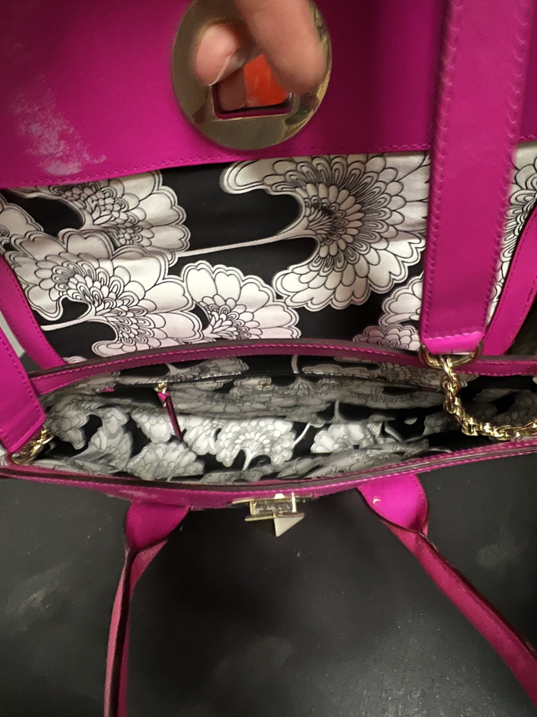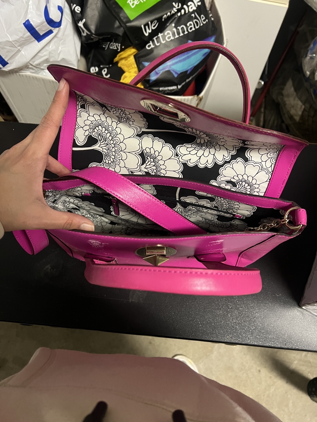 Pre-owned Kate Spade handbag. Hot pink leather. Floral interior. Top handle and shoulder strap. Medium size, perfect for everyday use.