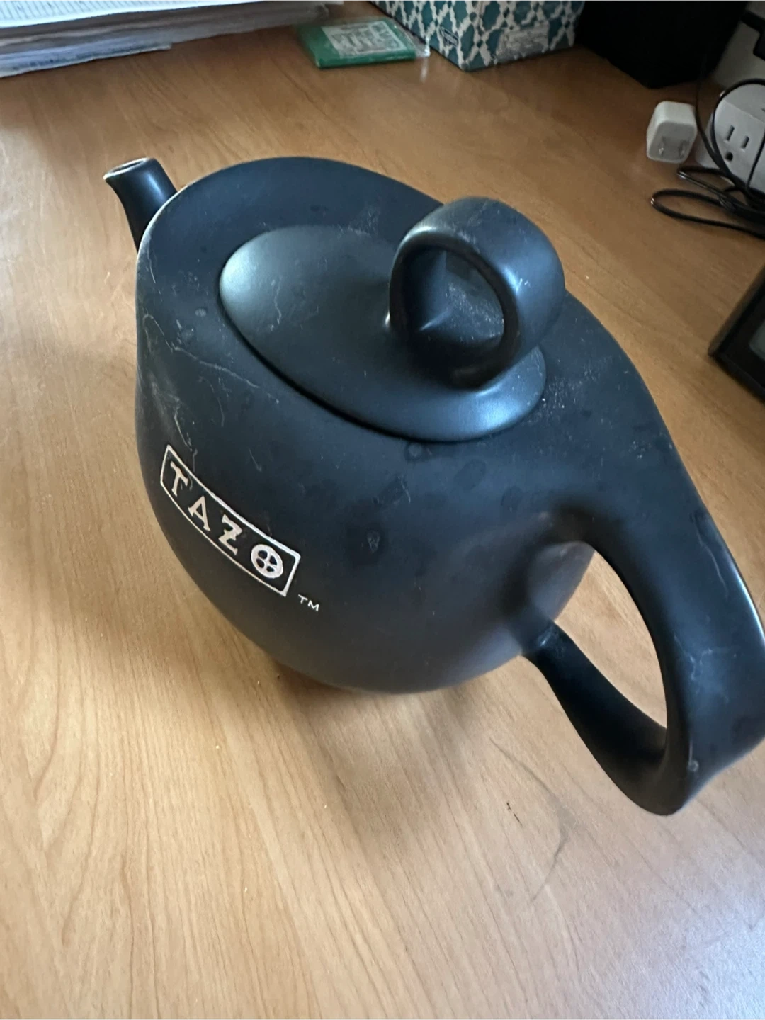 This is a black Tazo teapot. It has a unique rounded shape and a comfortable handle. It's perfect for brewing your favourite teas. It has never been used