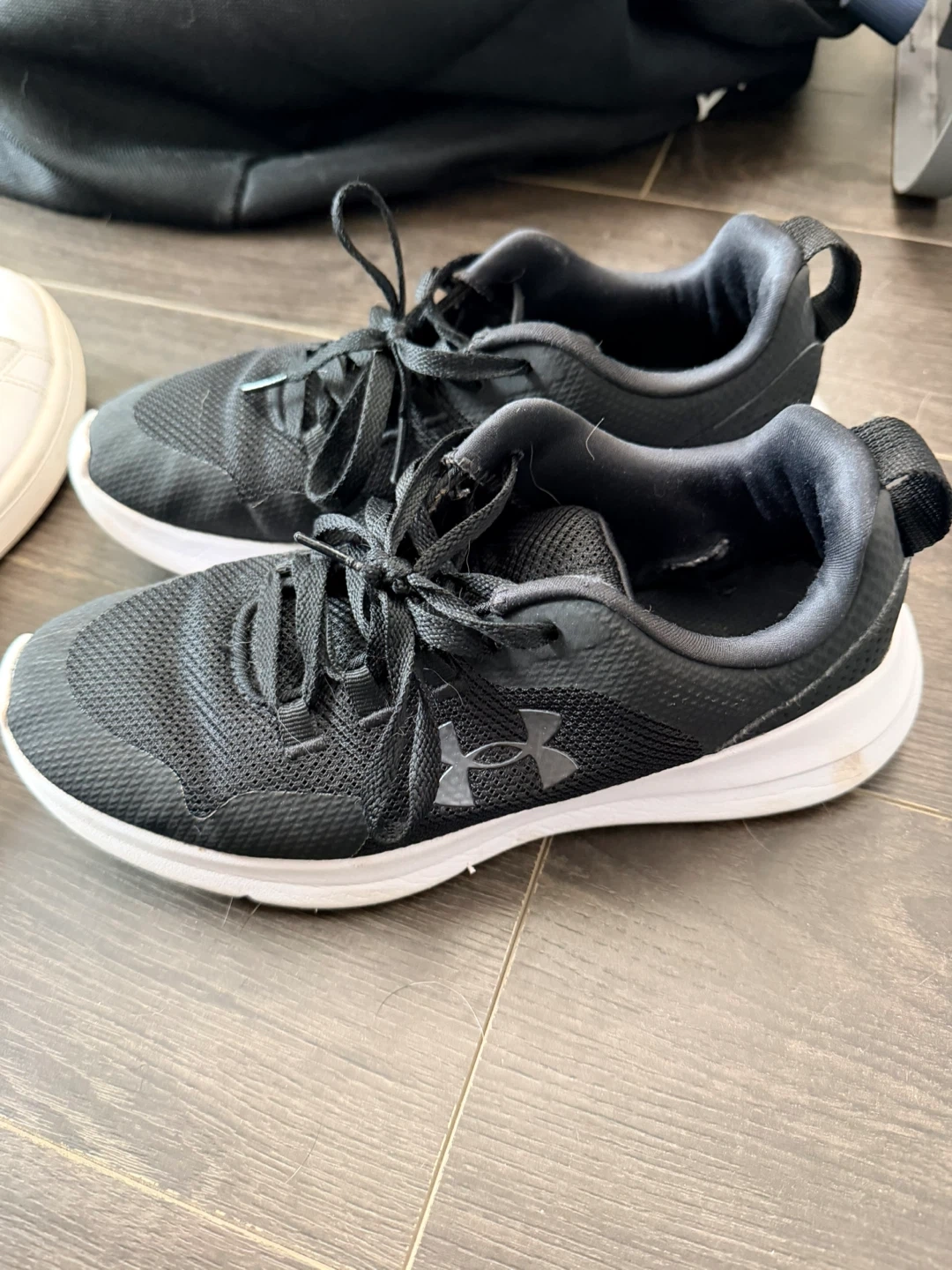 Under Armour black running shoes. Size 8. Adidas Size 7. These shoes have seen some miles and have wear, especially on the sole of the right shoe of the black ones, and the white is ripped. Still functional overall. If you know someone who could use them would be nice. Pick up only in Brentwood concord