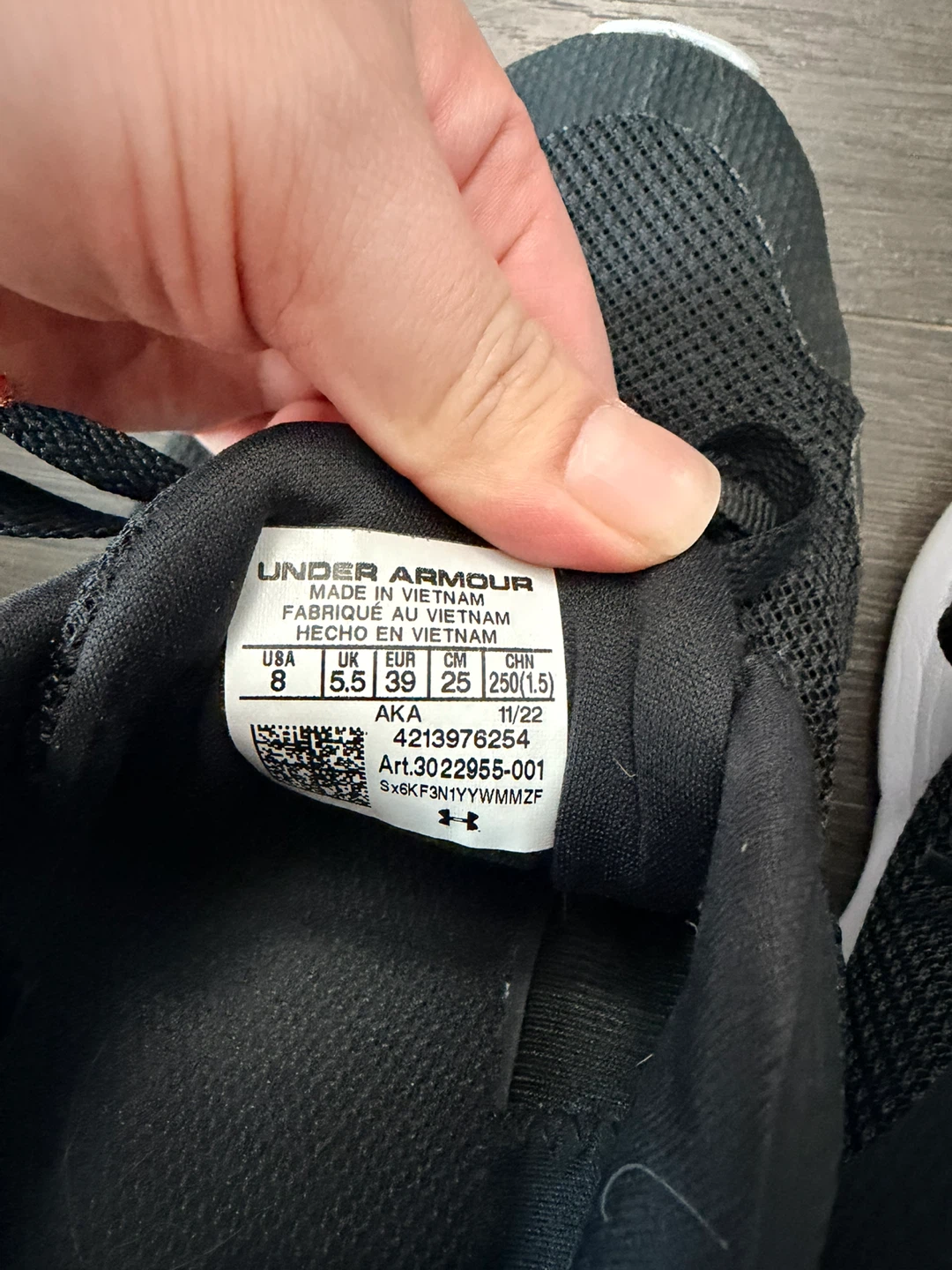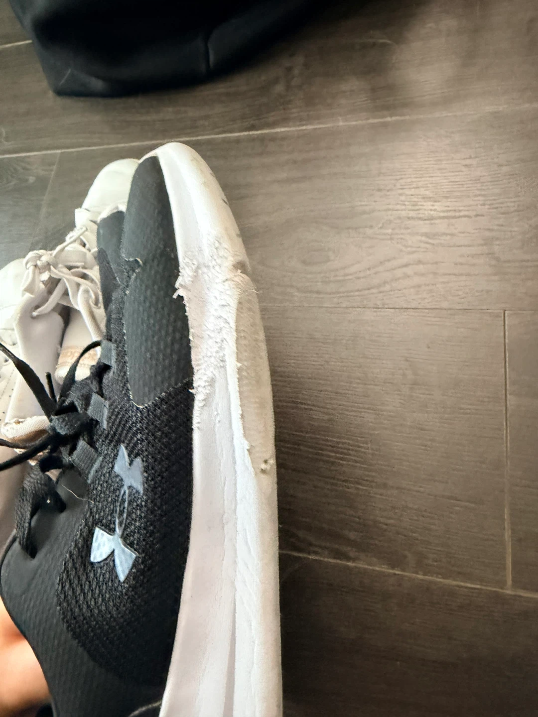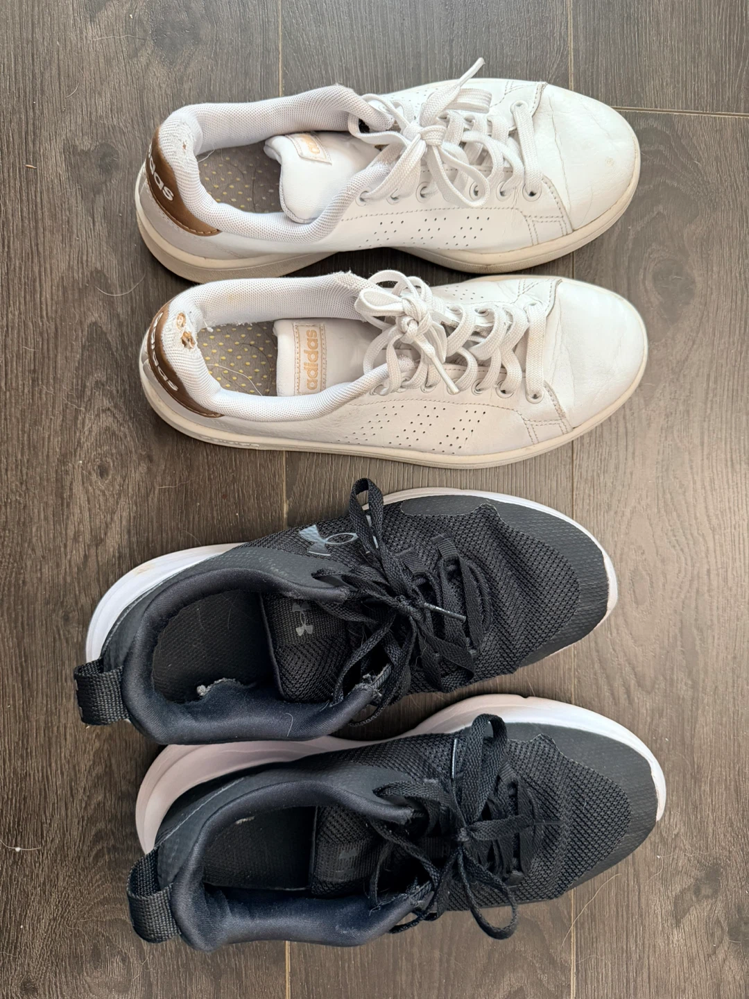 Under Armour black running shoes. Size 8. Adidas Size 7. These shoes have seen some miles and have wear, especially on the sole of the right shoe of the black ones, and the white is ripped. Still functional overall. If you know someone who could use them would be nice. Pick up only in Brentwood concord