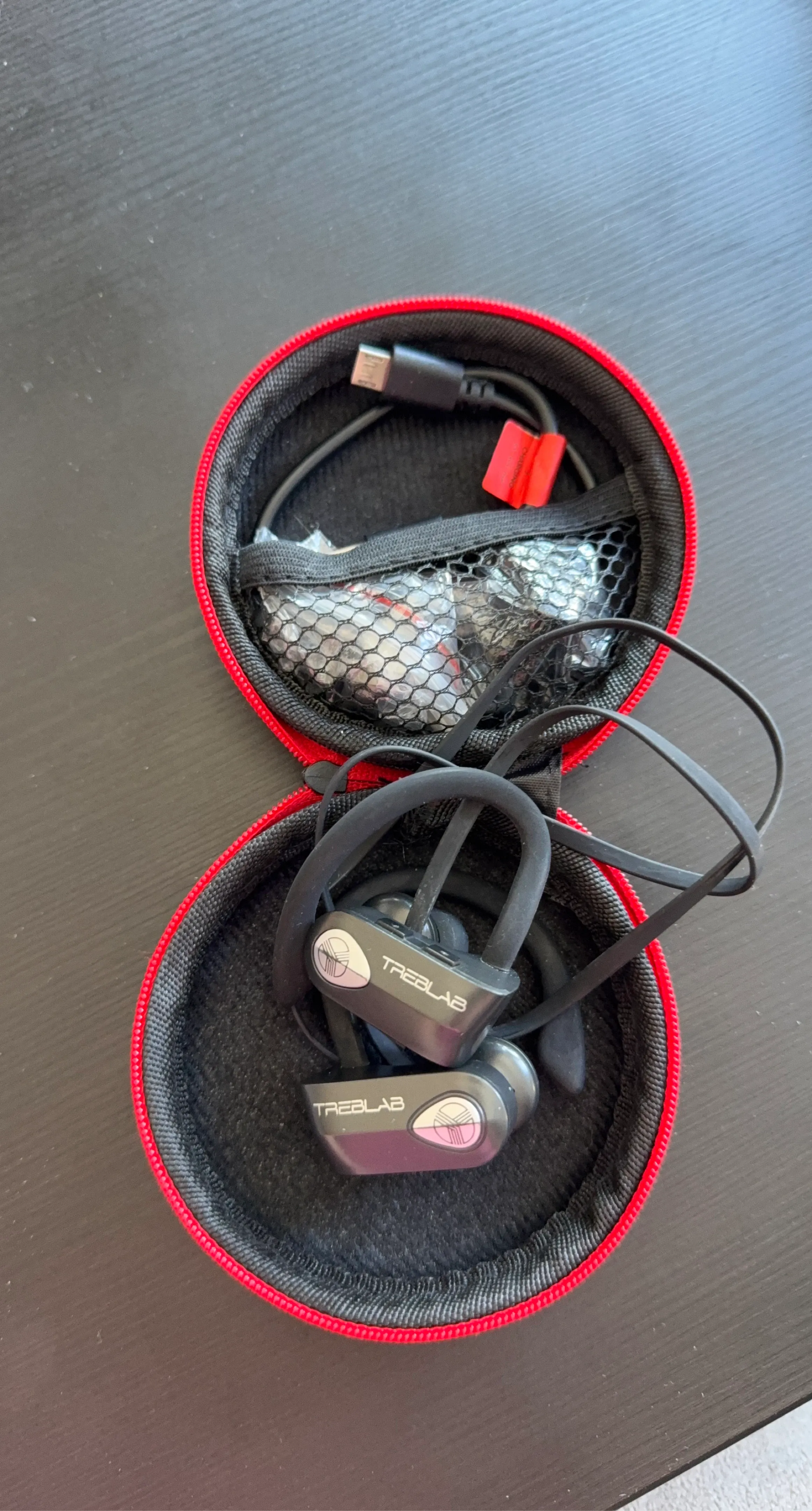 TREBLAB wireless noise cancelling earbuds come in a black charging case. Includes charging cable and assorted ear tips. These are great for workouts or on the go!