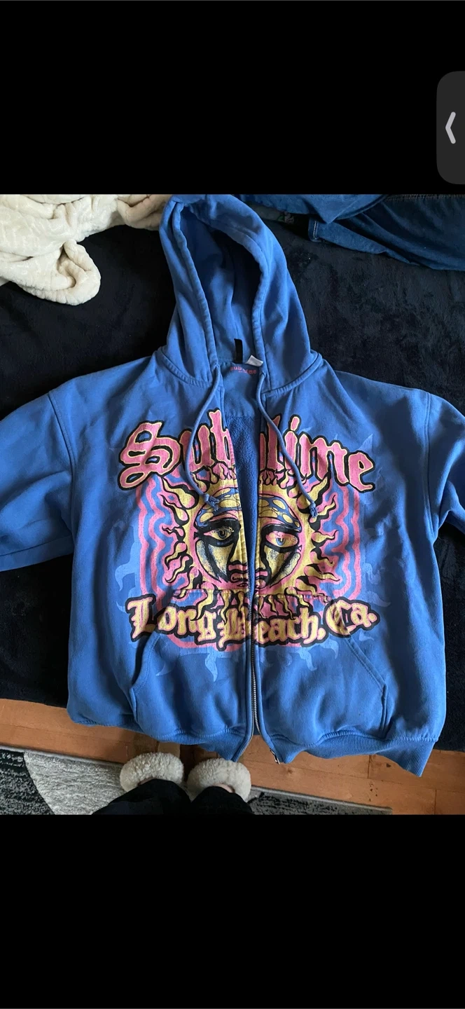 Selling a blue zip-up hoodie with a Sublime Long Beach CA graphic on the front. It's in great condition and ready for styling
