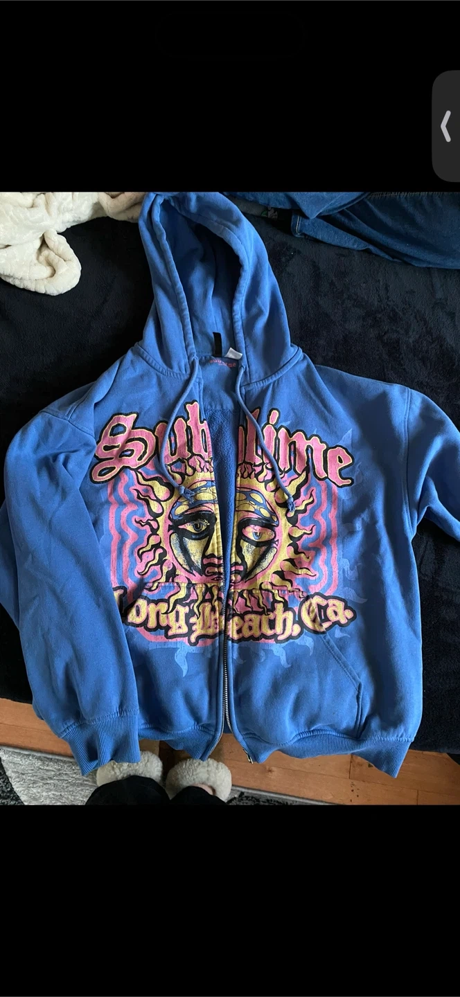 Selling a blue zip-up hoodie with a Sublime Long Beach CA graphic on the front. It's in great condition and ready for styling