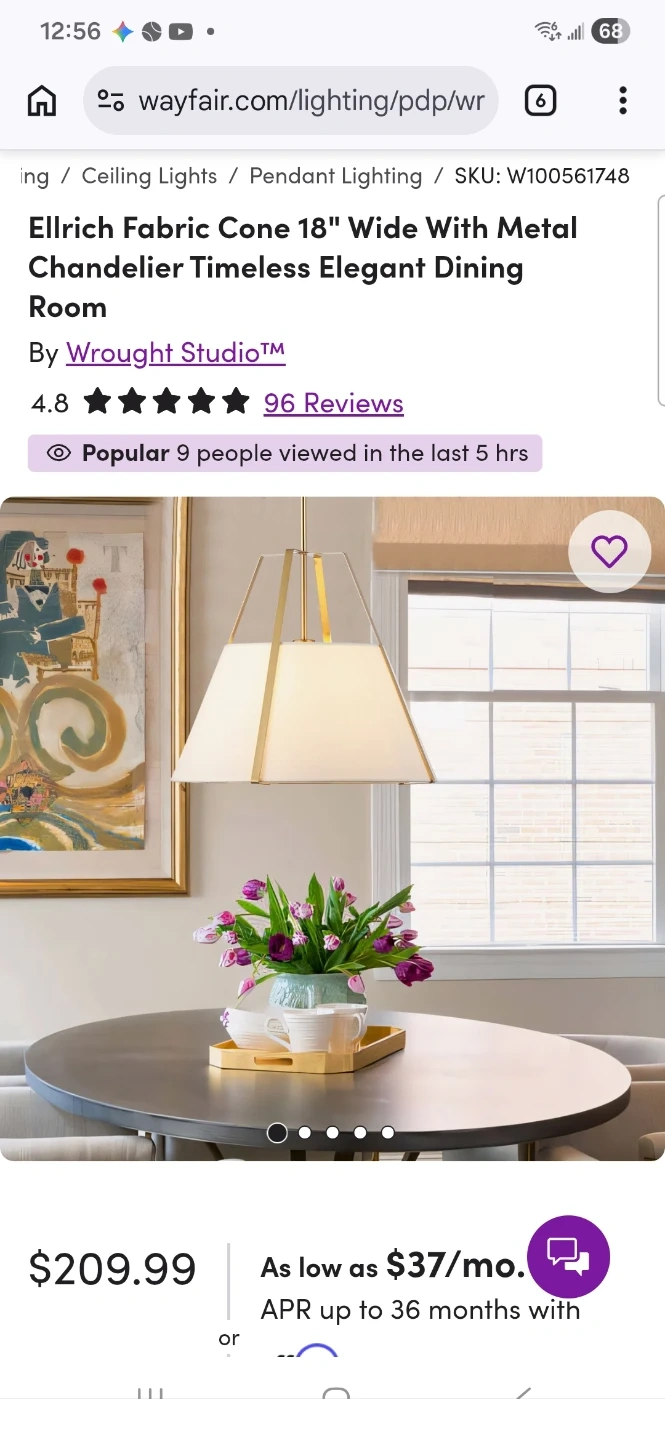 This Wrought Studio pendant light features a fabric cone shade and metal accents. It's 18" wide with a timeless design. Perfect for adding elegant lighting to a dining room.