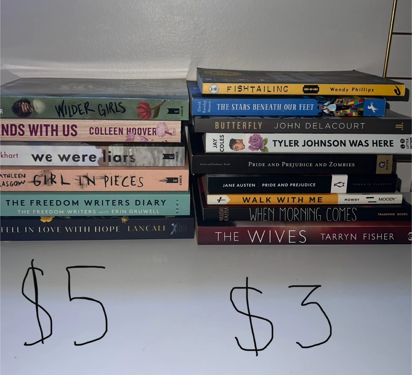 Selling a collection of books! Includes titles like: - Wilder Girls - It Ends With Us by Colleen Hoover - We Were Liars - Girl in Pieces - The Freedom Writers Diary - Fell in Love With Hope - Fishtailing by Wendy Phillips - The Stars Beneath Our Feet - Butterfly by John Delacourt - Tyler Johnson Was Here - Pride and Prejudice and Zombies - Pride and Prejudice by Jane Austen - Walk With Me - When Morning Comes - The Wives by Tarryn Fisher All in excellent condition. I can do discounts if you buy 3 or more :) Most books are $3 each, some are $5