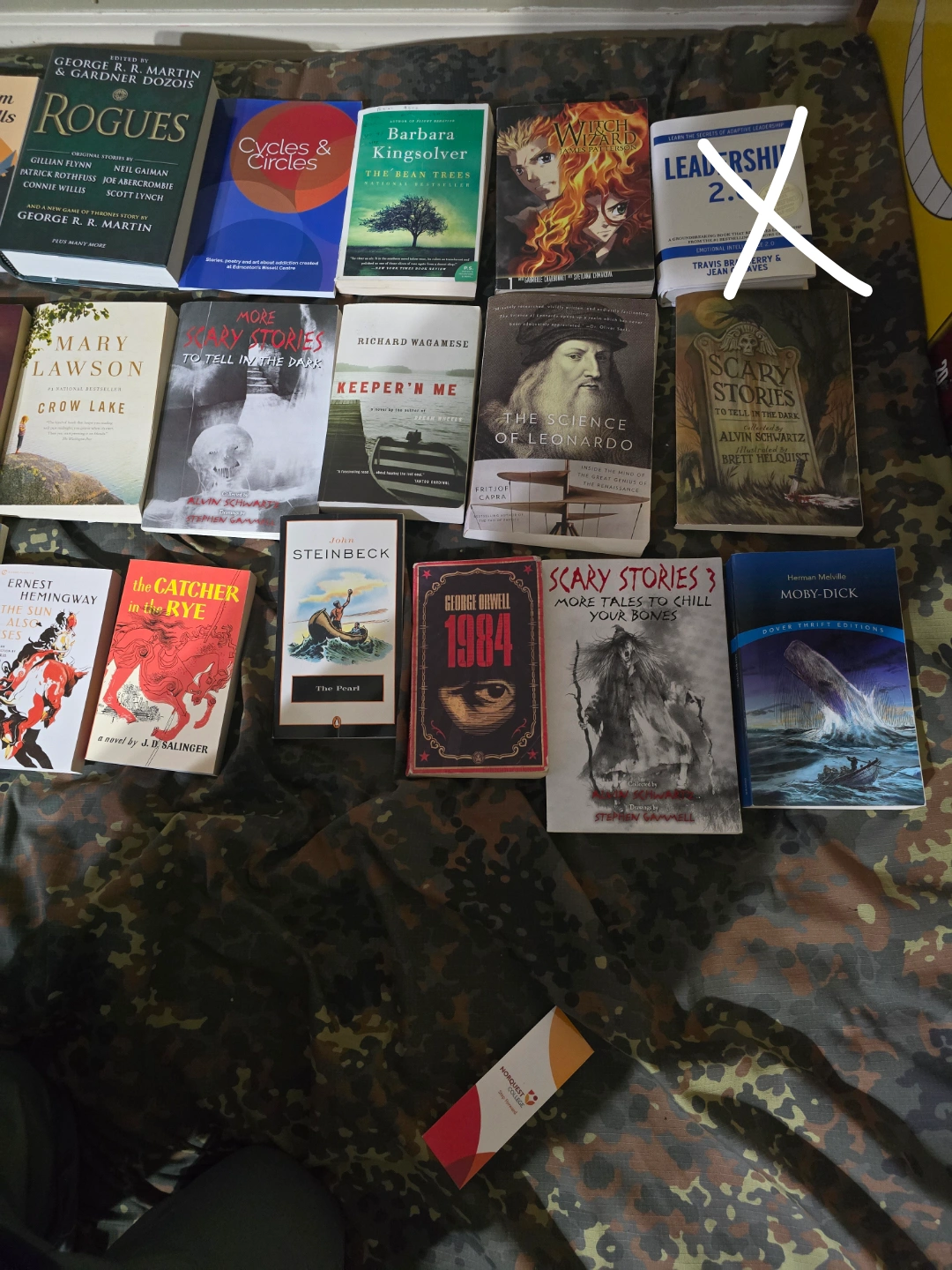 A mixed lot of books for sale! Titles include: Rogues, Cycles & Circles, The Bean Trees, Leadership 2.0, Crow Lake, More Scary Stories to Tell in the Dark, Keeper'n Me, The Science of Leonardo, Scary Stories to Tell in the Dark, For Whom the Bell Tolls, The Catcher in the Rye, The Pearl, 1984, Scary Stories 3, and Moby Dick