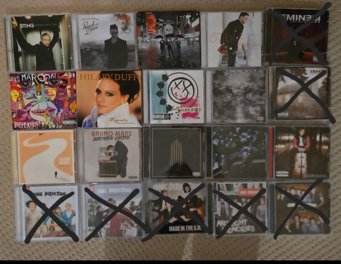 Selling a collection of CDs from various artists. Includes a mix of genres and popular bands like Sting, Maroon 5, Eminem, Nirvana, and more! Great for music lovers looking to expand their collection. Condition is good, with some wear on the cases but the CDs themselves are in playable condition All the right reasons- Nickelback The long road - Nickelback The State - Nickelback Avenged sevenfold Avenged sevenfold The colour and the shape-Foofighters Livin' on the edge- Aerosmith Permanent Vacation - Aerosmith The Doors Live + cuddly- Nomeansno Echoes, Silence, Patience & Grace - FooFighters The Essentials- Foreigner Lightning bolt - Pearl Jam Perverse - Jesus Jones Battle of evermore-Lovemongers Greatest hits - Foofighters Dookie- Green day Live and loud 2009- Buckcherry 15- Buckcherry One sided Story- Pursuit of Happiness Crush- Doughboys Wasting Light- foo fighters warning- Green Day Brigade - Heart Desire Walks on - Heart Puta's Fever - Mano Negra Greatest hit - Ramones There is nothing left to lose -Foo fighters The Ultimate experience-Jimi Hendrix Dangerous curves - Lita Ford Zootopia-U2 British Lion - Steve Harris Sonic Highway - Too fighters Nevermind - Nirvana Greatest hits- chilliwack Live Between Us - Tragically Hip Nirvana-Nirvana No lines on the Horizon - U2 Montage of heck - Kurt Cobain Icon- Nirvana Brand New day-sting Too weird to live, too rare to die -Panic at the disco A little bit longer - Jonas Brothers Christmas - Michael Buble Overexposed - Maroons Dignity- Hilary duff I love you- The Neighbourhood Doo-wop s hooligans - Bruno mars Unorthodox Jute bot - Bruno Mars Born sinner - J cole 2014 Forest hills drive- j cole cole world- J Cole Automatic for the people- R.E.M. Alapalooza- Weird Al Yankovic Number ones- Michael Jackson Superunkown- Soundgarden Silver side up- Nickelback Tragic Kingdom- No Doubt Purple- Stone Temple Pilots The world hood of the world (as such)- Nomeansno No fixed address- Nickelback