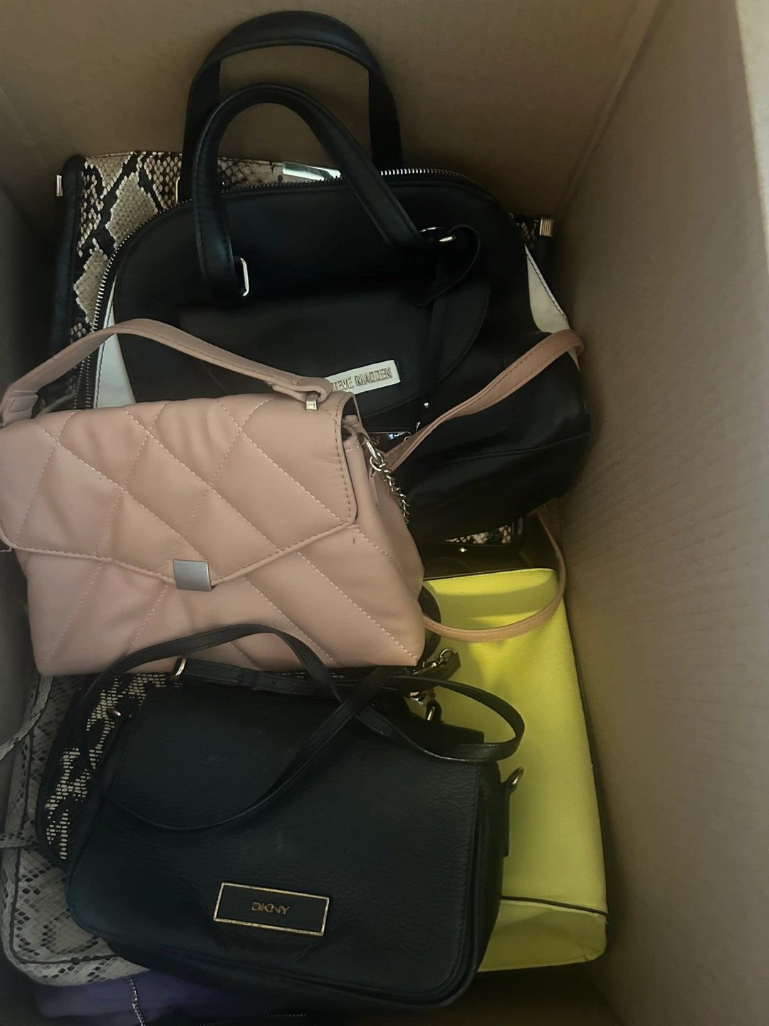 Selling a box of mixed handbags! a variety of styles and brands including DKNY and Steve Madden. Great for someone looking to expand their collection or resell!