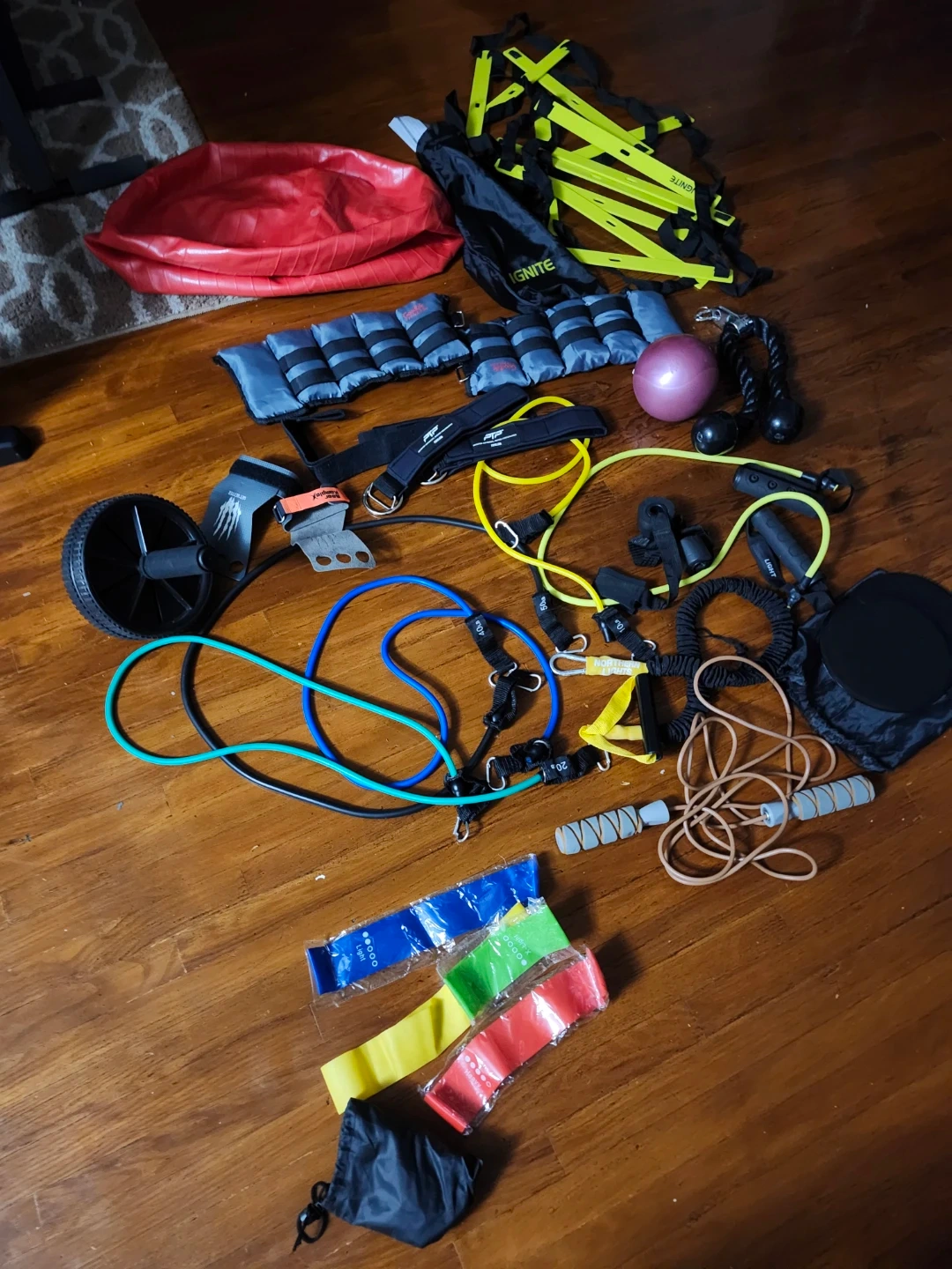 1000+Selling a mixed set of home gym equipment. Includes items like resistance bands, ankle weights, an ab roller, and more! Great for setting up your own workout space at home Worth more than 250$ . Great condition. Like new Resistance Bands Set exercise ball mini excercise / medicine ball Black Tricep Rope Pull Down Cable PTP Ankle Straps - Like New AB roller Excerxise core discs Ankle Weights set Bear KompleX Get Better Grips - Size M Ignite Sprint Agility Ladder Jump rope others
